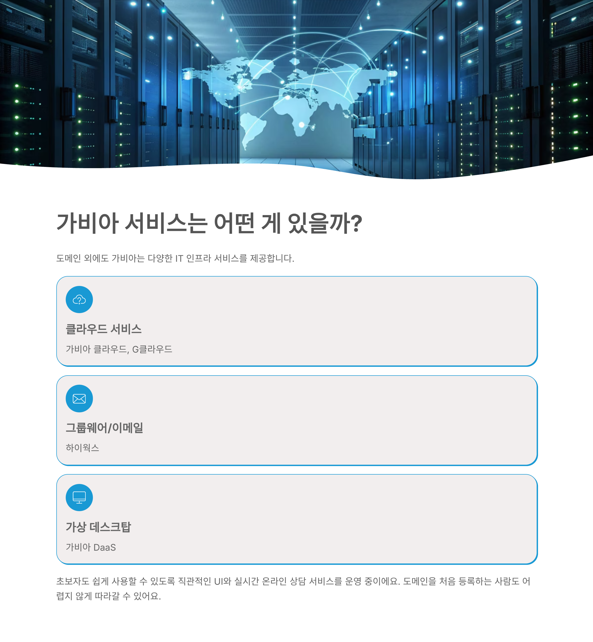 도메인 외에도 가비아는 다양한 IT 인프라 서비스를 제공합니다.