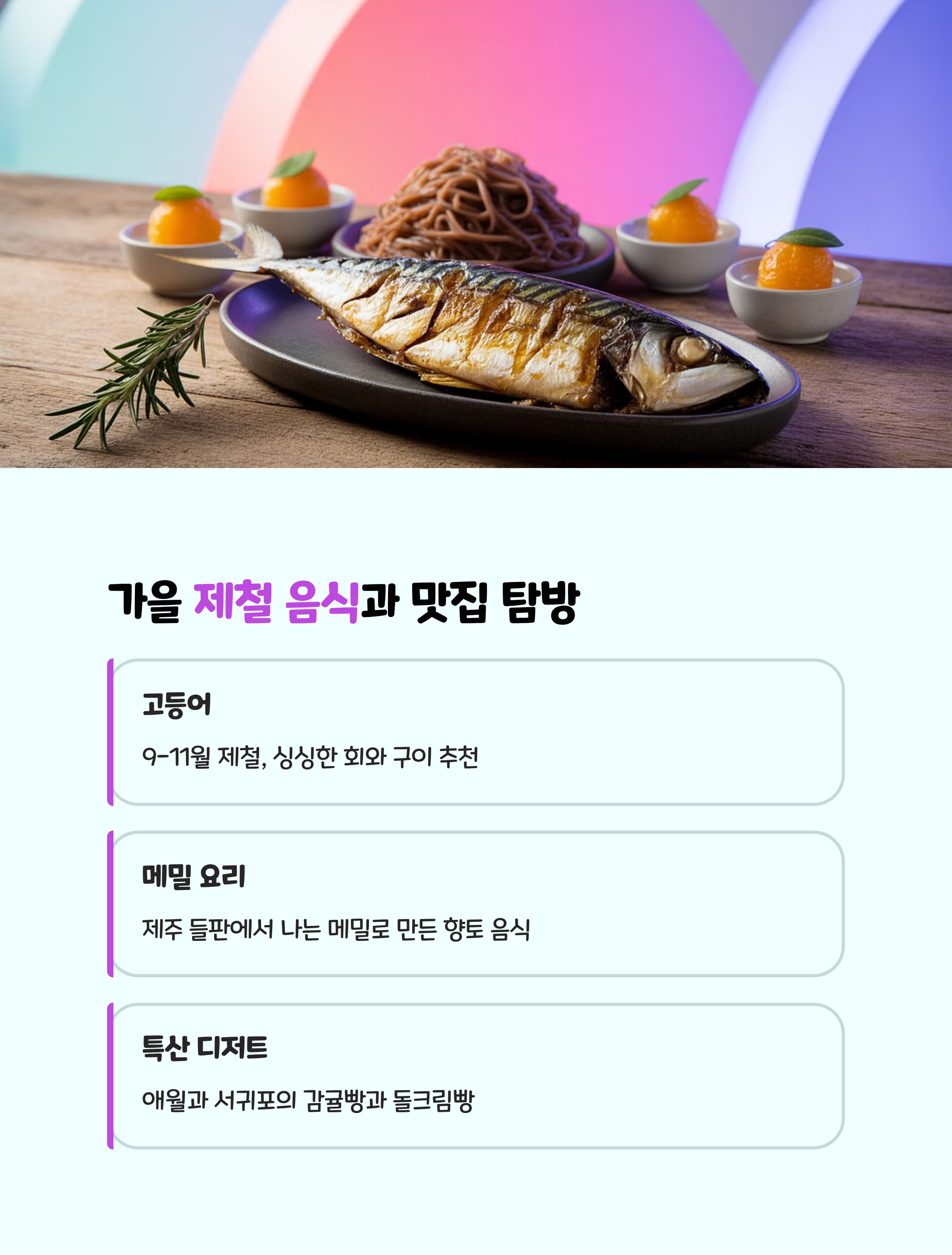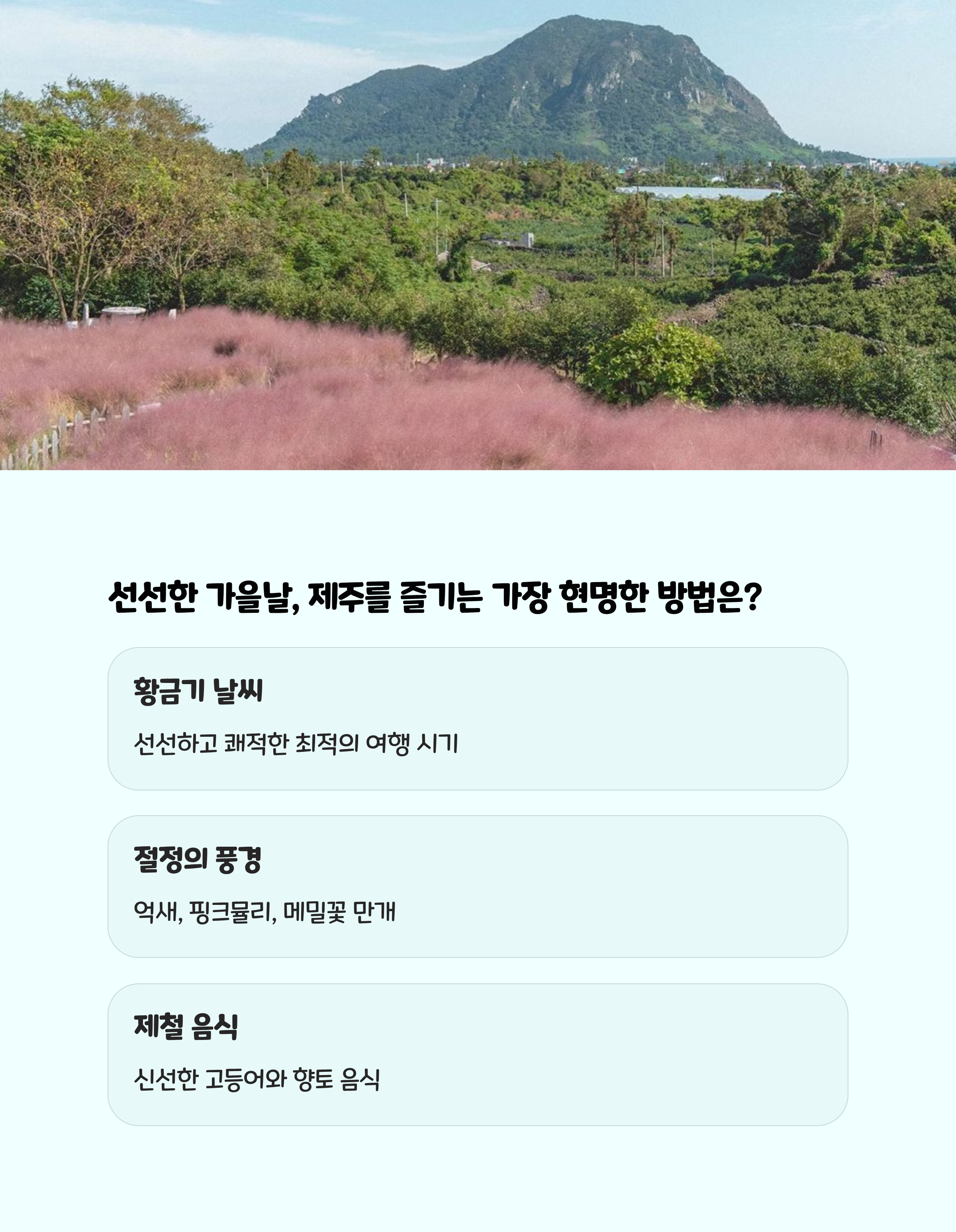 가을은 제주 여행의 황금기라 불릴 만큼 풍경과 먹거리, 날씨가 모두 완벽합니다.