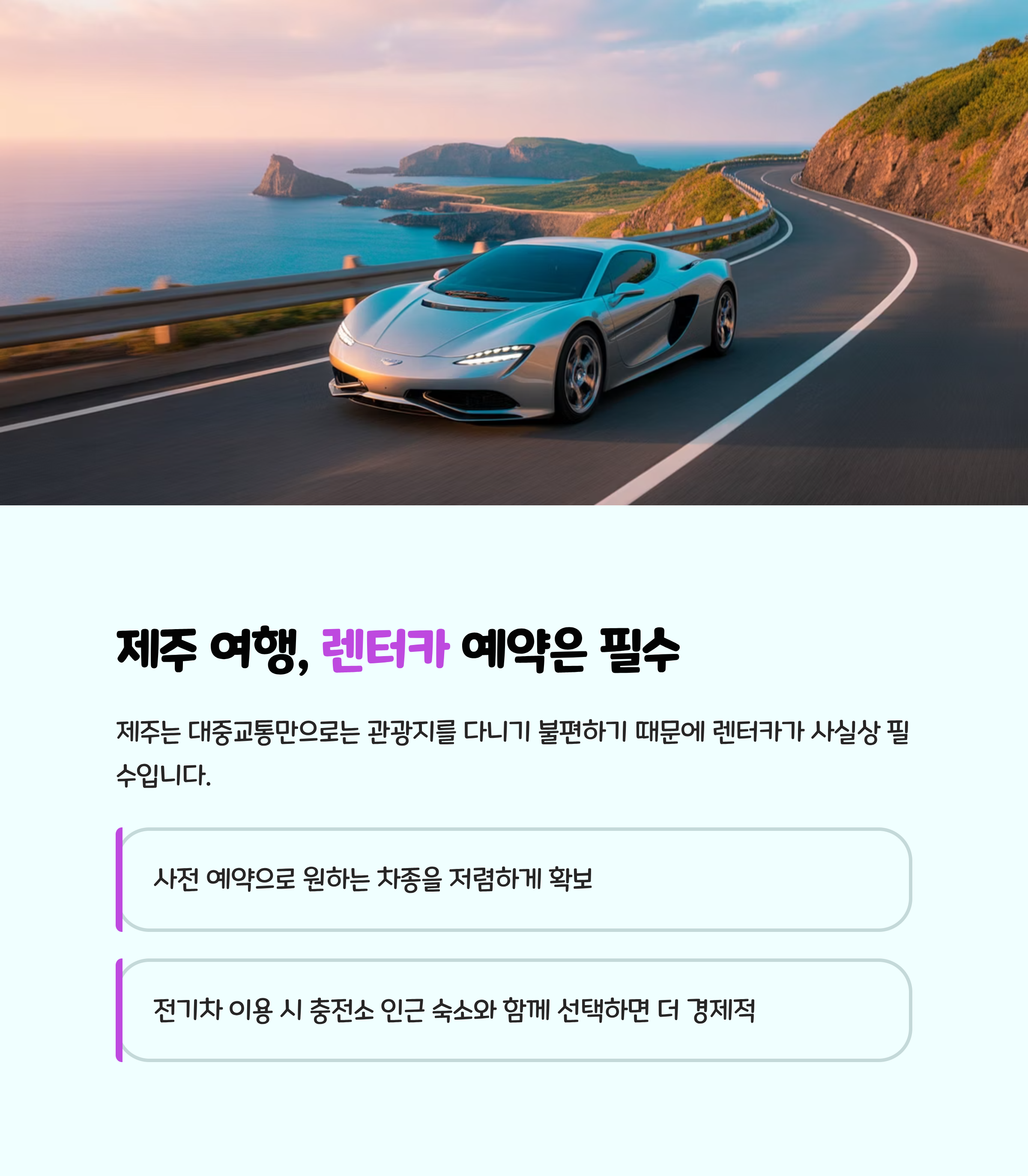 제주는 대중교통만으로는 관광지를 다니기 불편하기 때문에 렌터카가 사실상 필수입니다.