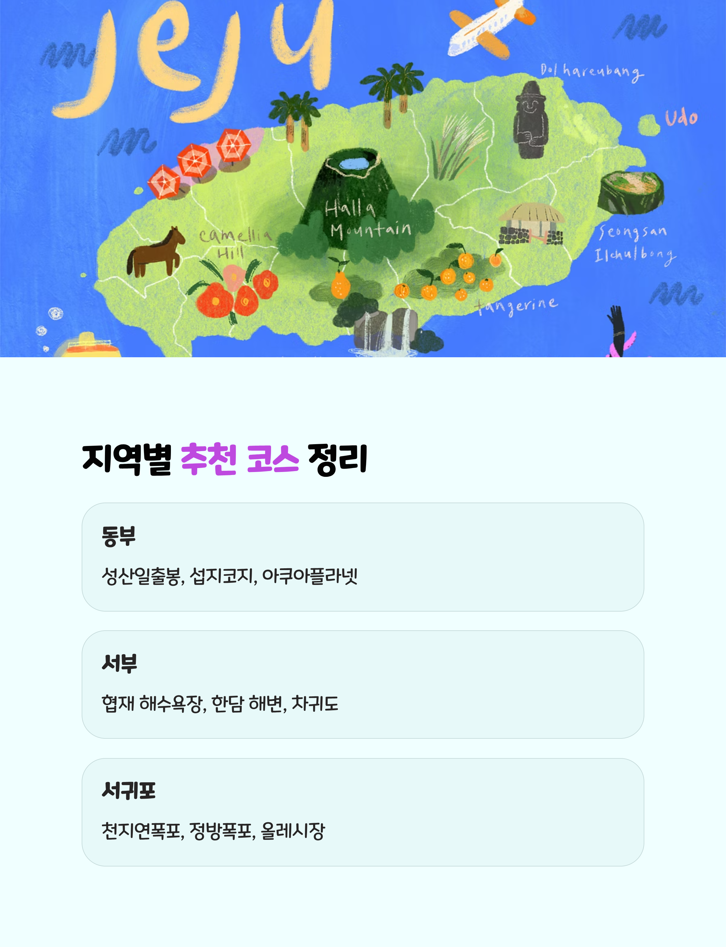 제주는 지역마다 특색이 달라 코스를 나눠 즐기는 것이 좋습니다.