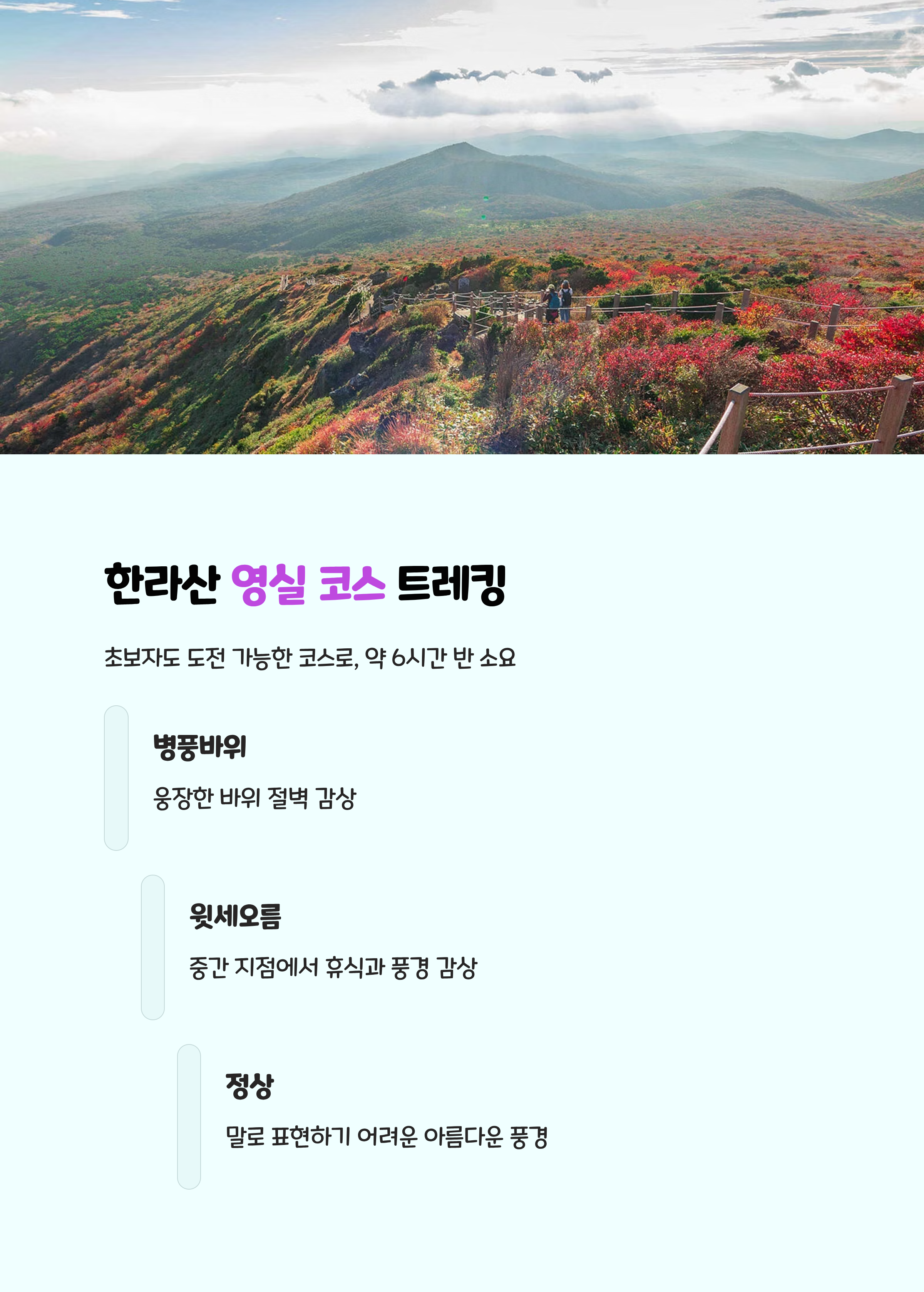 영실 코스는 초보자도 도전 가능한 한라산 등반로로, 약 6시간 반 정도 소요됩니다.