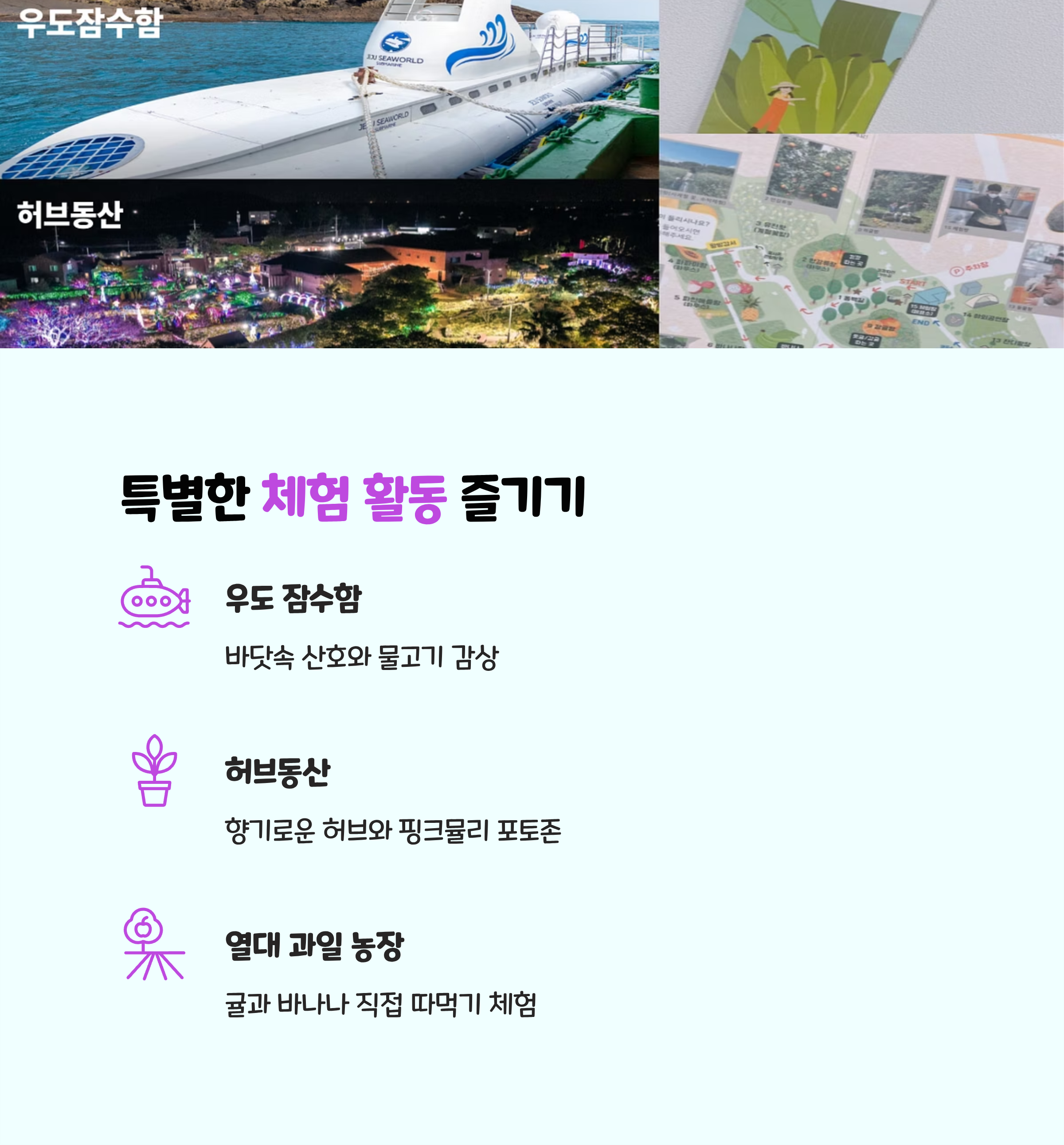 우도 잠수함에서는 바닷속 산호와 물고기를 감상할 수 있고, 허브동산에서는