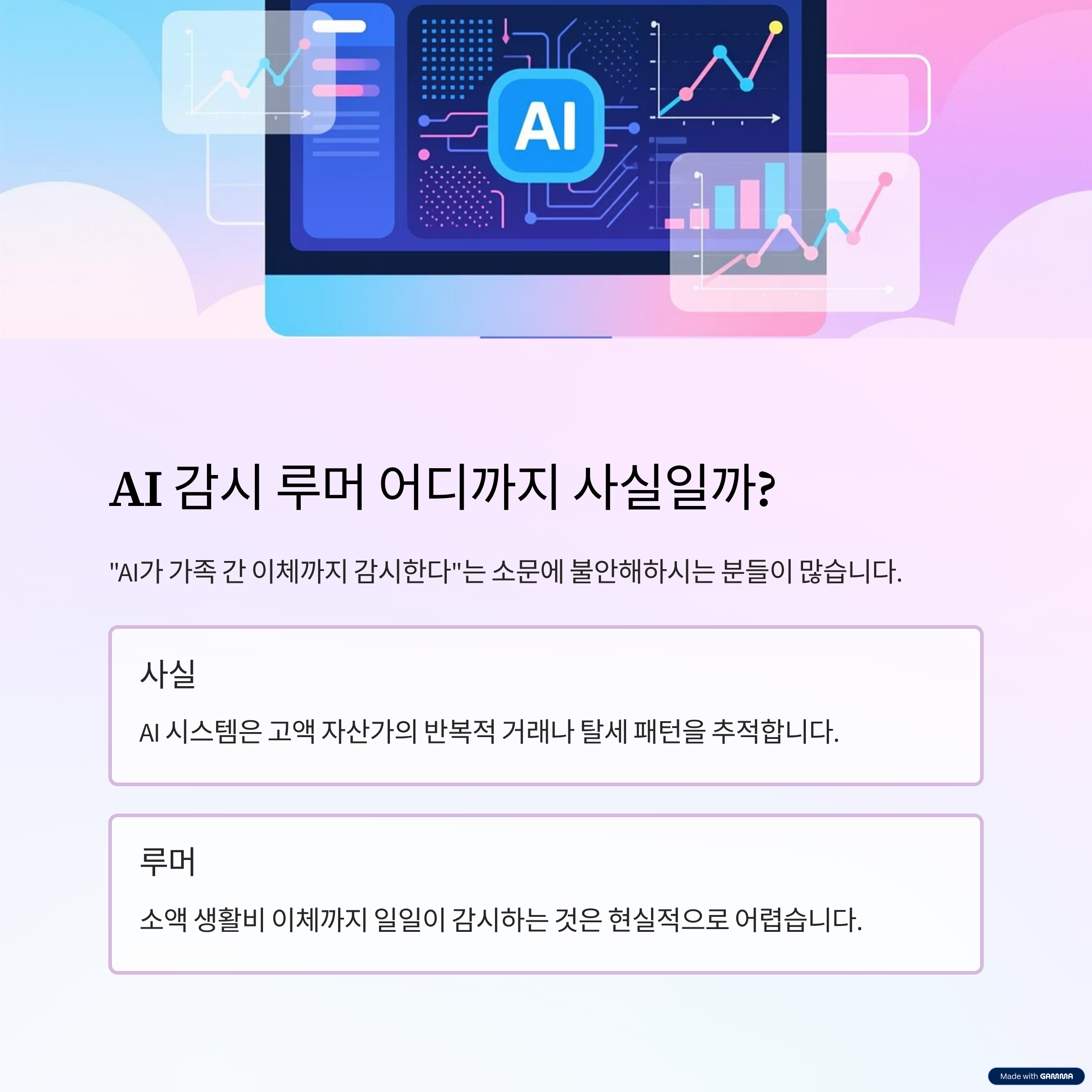 많은 분들이 “AI가 가족 간 이체까지 감시한다”는 소문에 불안해하시는데요. 실제로 AI 기반 시스템은 고액 자산가의 반복적 거래나 탈세 패턴을 추적하기 위한 장치입니다. 소액 생활비 이체까지 일일이 감시하는 것은 현실적으로 어렵습니다.