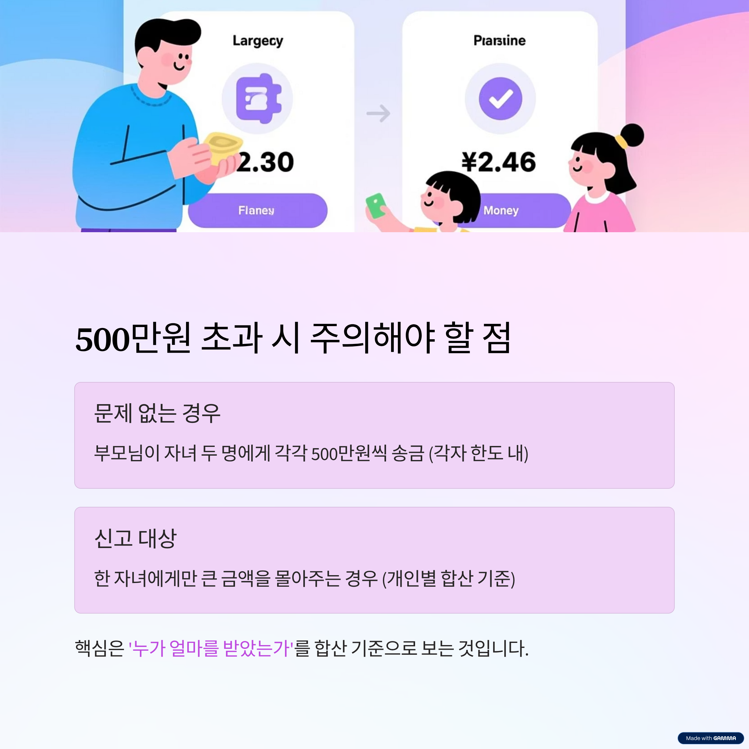 부모님이 자녀 두 명에게 각각 500만원을 송금하는 것은 문제가 되지 않지만, 한 자녀에게만 큰 금액을 몰아주면 증여세 신고 대상이 될 수 있습니다. 결국 핵심은 ‘누가 얼마를 받았는가’를 합산 기준으로 보는 점이에요.