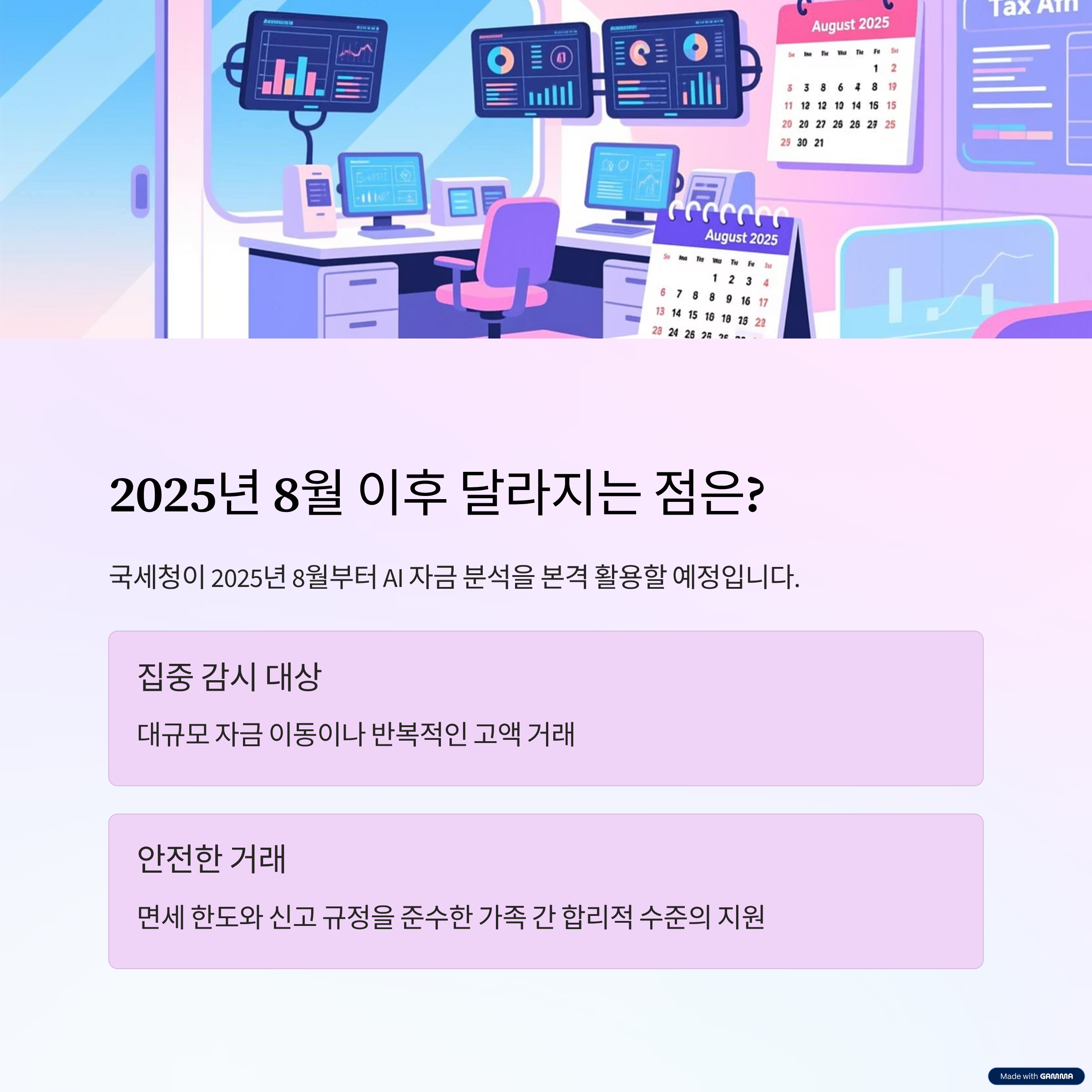 국세청이 2025년 8월부터 AI 자금 분석을 본격 활용할 예정입니다. 이는 대규모 자금 이동이나 반복적인 고액 거래를 집중적으로 살피는 것이지, 가족 간 합리적 수준의 지원을 제한하는 것은 아닙니다. 따라서 면세 한도와 신고 규정을 준수하면 크게 걱정하지 않아도 됩니다.