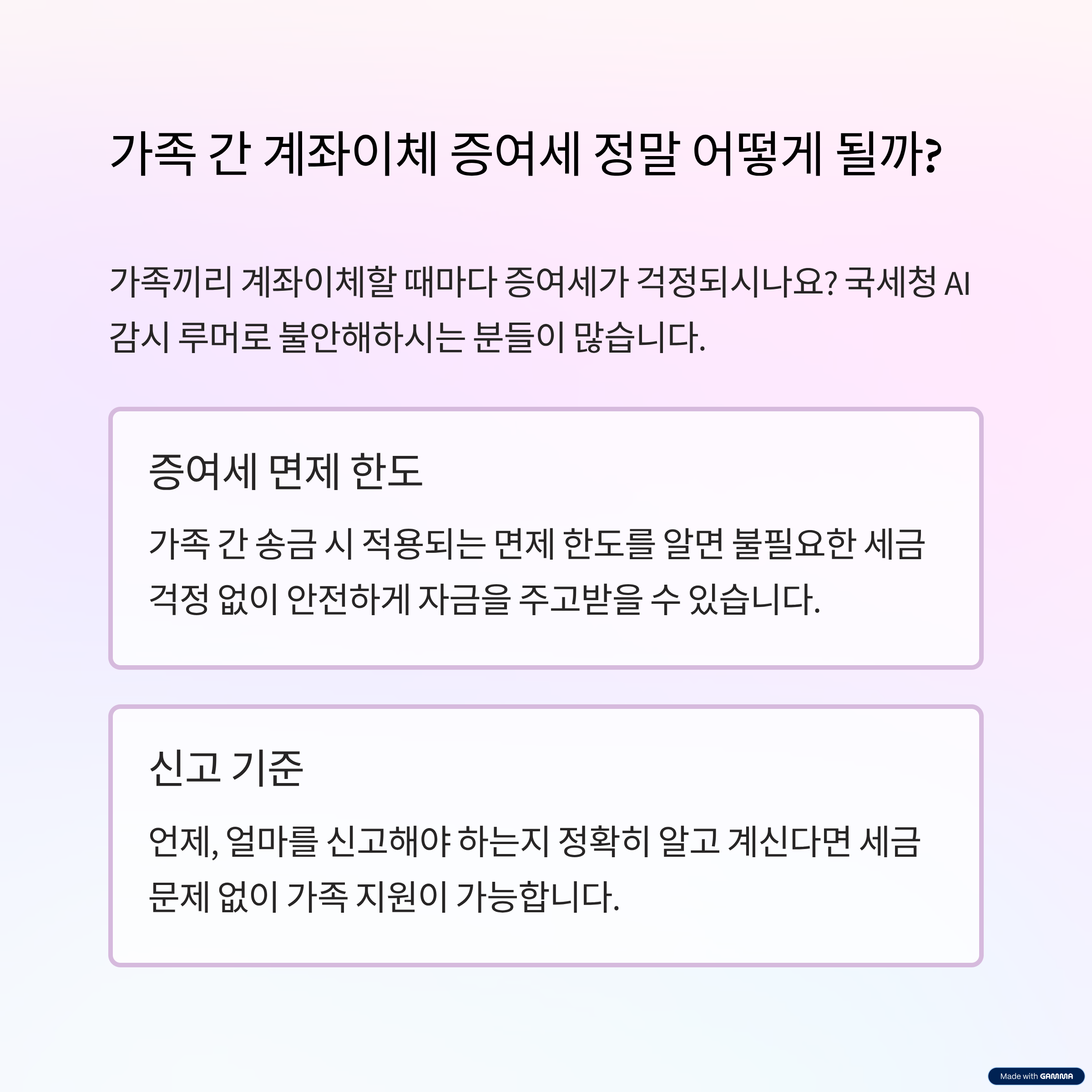 가족끼리 계좌이체를 할 때마다 증여세가 걱정되신 적 있으신가요? 최근에는 국세청의 AI 감시 루머까지 돌면서 불안해하는 분들이 많아지고 있습니다. 하지만 증여세 면제 한도와 신고 기준을 잘 이해하고 활용한다면 불필요한 걱정 없이 안전하게 자금을 주고받을 수 있답니다. 이번 글에서는 가족 간 계좌이체 시 알아야 할 증여세 한도, 면세 기준, 그리고 루머에 대한 진실까지 한눈에 정리해 드리겠습니다.