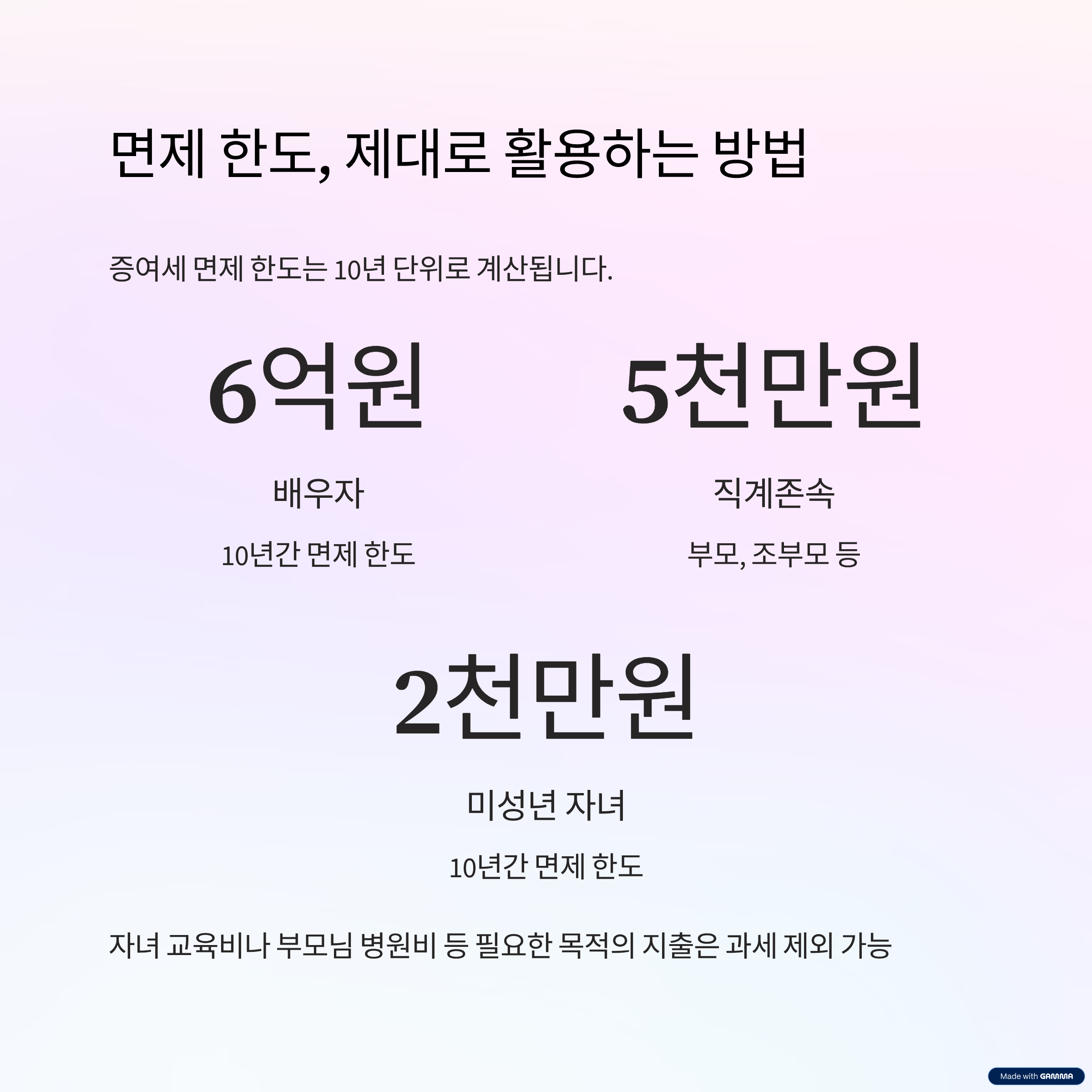 증여세 면제 한도는 10년 단위로 계산됩니다. 배우자에게는 6억원, 직계존속에게는 5천만원, 미성년 자녀에게는 2천만원까지 증여세가 면제됩니다. 자녀 교육비나 부모님 병원비처럼 필요한 목적에 맞춰 지출되는 비용은 과세에서 제외되는 경우도 많습니다.