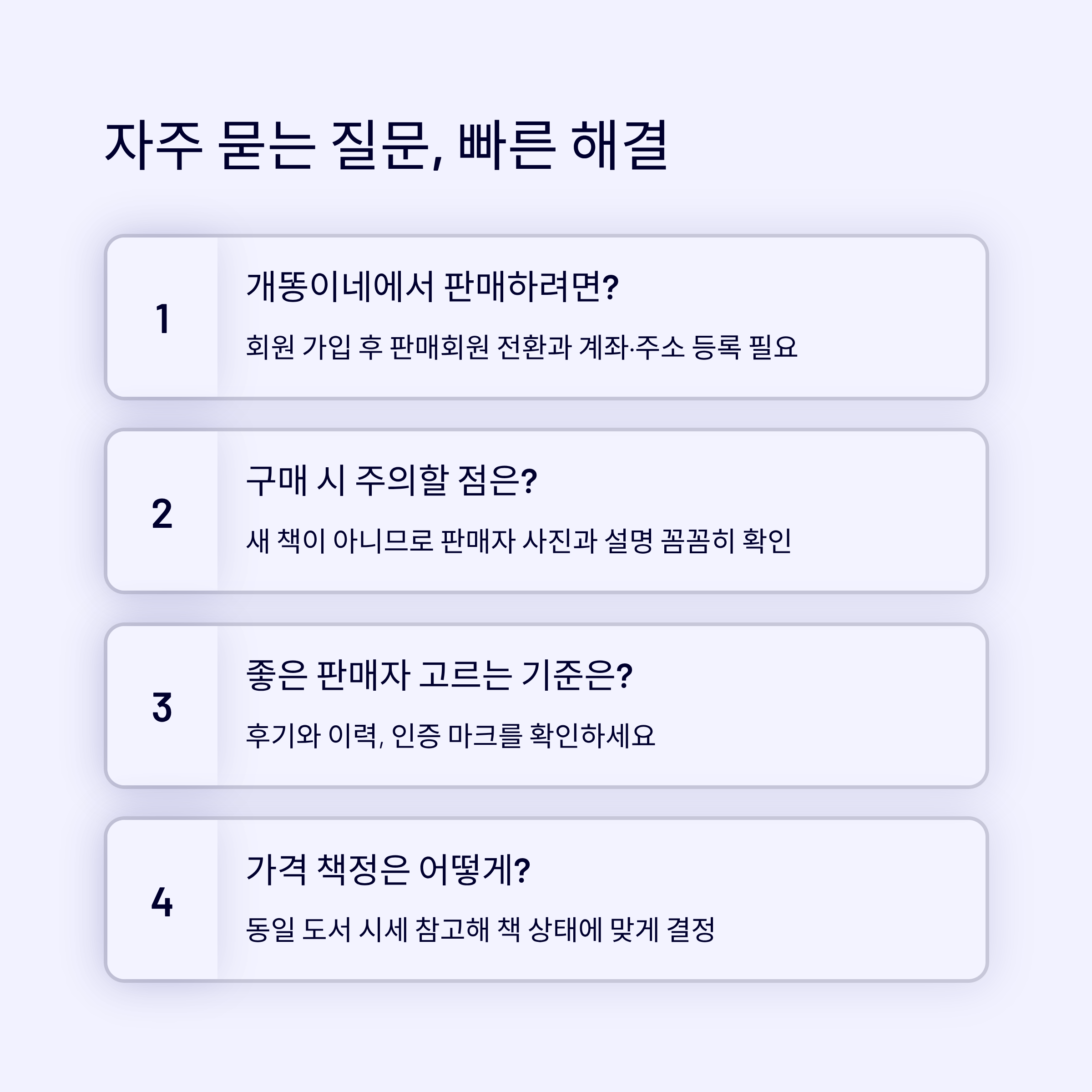 중고책 거래를 계획 중이신가요? 개똥이네는 판매자와 구매자 모두에게 편리한 플랫폼으로, 책의 가치를 새롭게 이어주는 공간입니다. 판매를 준비하는 단계부터 사진 촬영, 가격 책정, 플랫폼 비교, 그리고 구매자가 놓치지 말아야 할 체크 포인트까지 꼼꼼히 정리했어요. 이 글을 통해 똑똑한 거래 방법을 익히고, 환경까지 지키는 현명한 소비로 이어가시길 바랍니다.