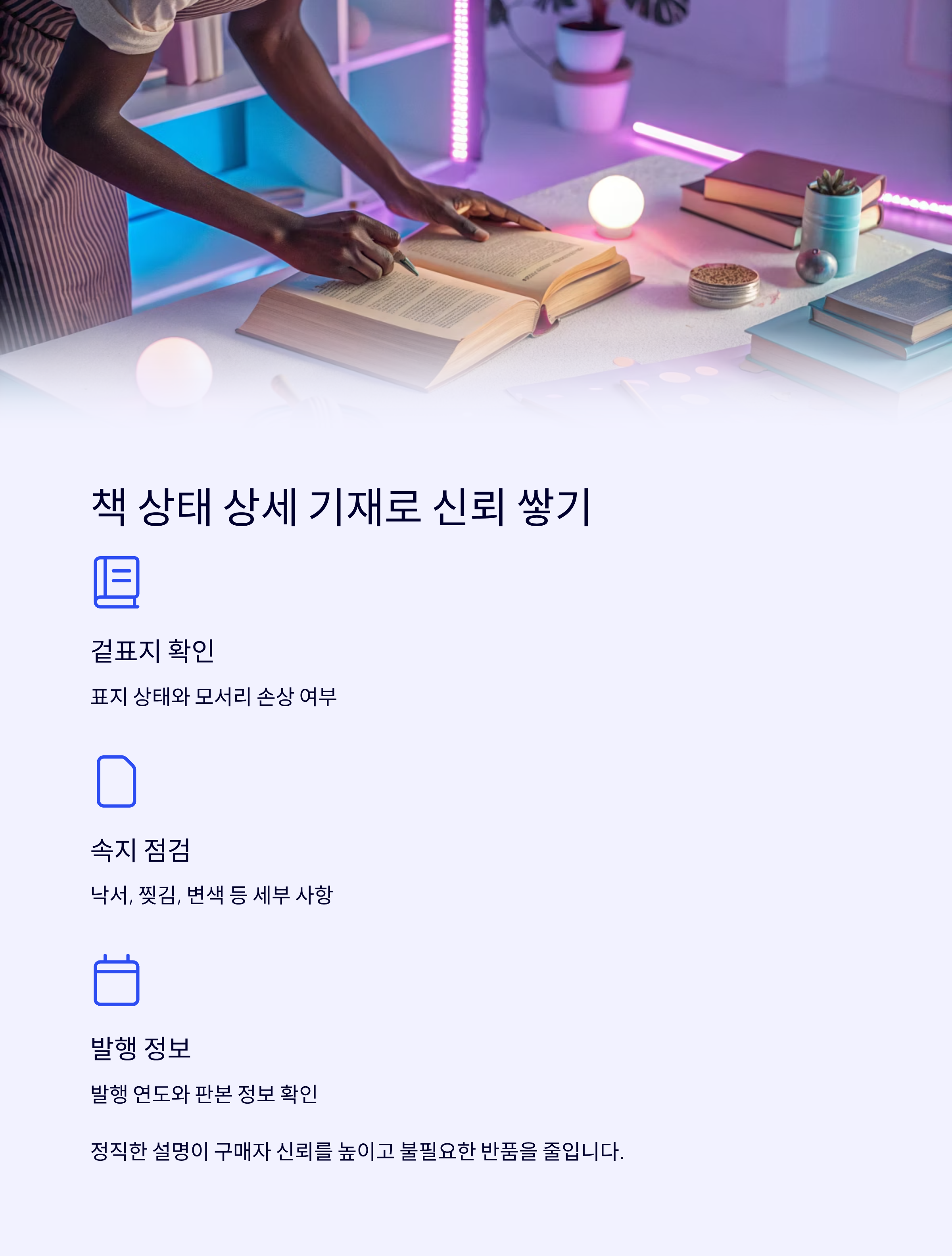판매할 책은 겉표지, 속지, 발행 연도, 낙서 여부 등을 꼼꼼히 확인해 기록하세요. 사용감이나 변색 같은 작은 부분도 솔직하게 공개하는 것이 중요합니다. 이런 정직한 설명이야말로 구매자 신뢰를 높이고 불필요한 반품을 줄이는 핵심 비법이에요.