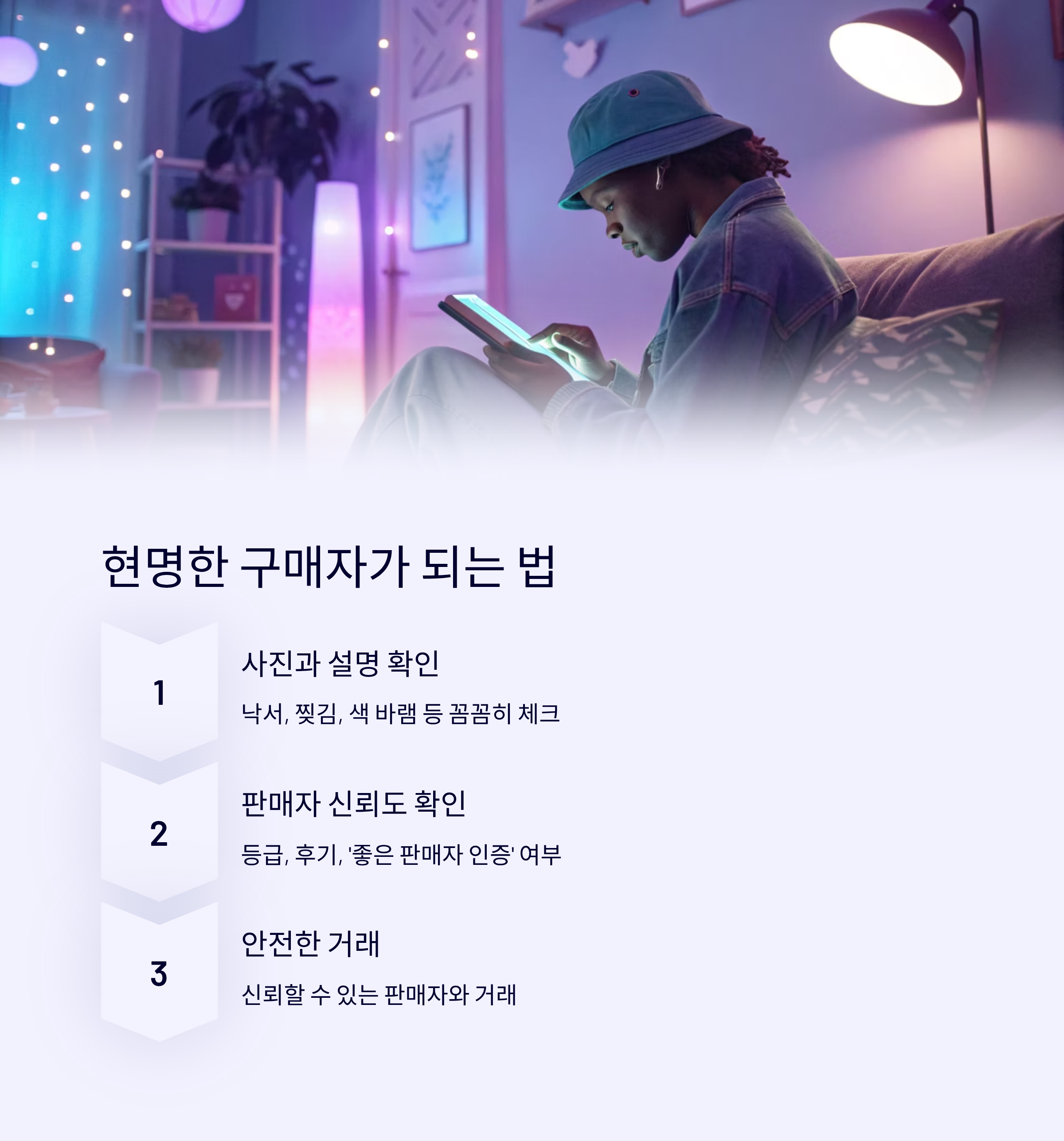 구매자는 판매자의 사진과 설명을 꼼꼼히 확인해야 해요. 특히 낙서, 찢김, 색 바램 같은 부분은 놓치면 안 됩니다. 판매자 등급과 후기, ‘좋은 판매자 인증’ 여부를 확인하고 신뢰할 수 있는 판매자에게서 거래하는 것이 안전합니다.
