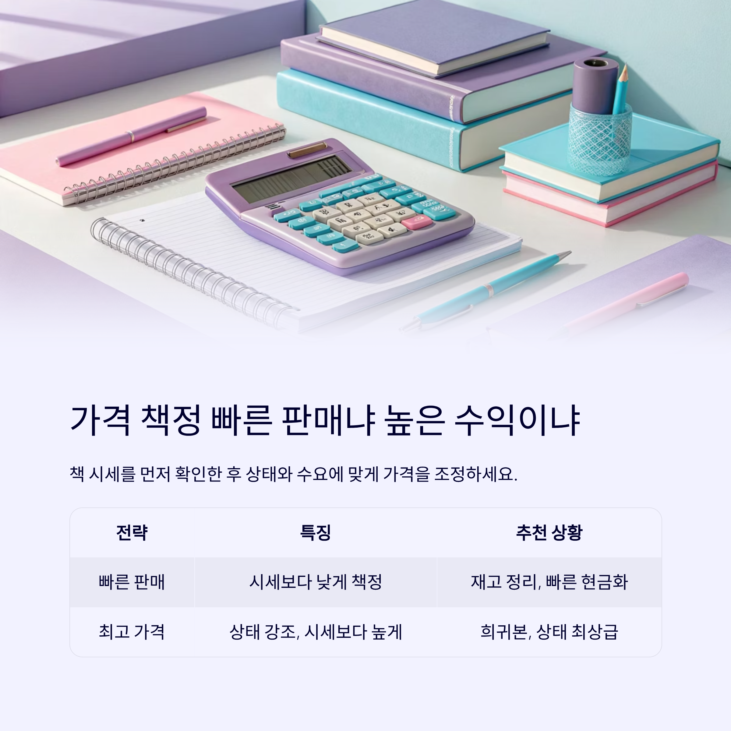 책 시세를 먼저 확인한 후 상태와 수요에 맞게 가격을 조정하세요. 급하게 팔아야 한다면 시세보다 조금 낮게, 상태가 뛰어나거나 희귀본이라면 조금 높게 잡는 전략도 효과적입니다.