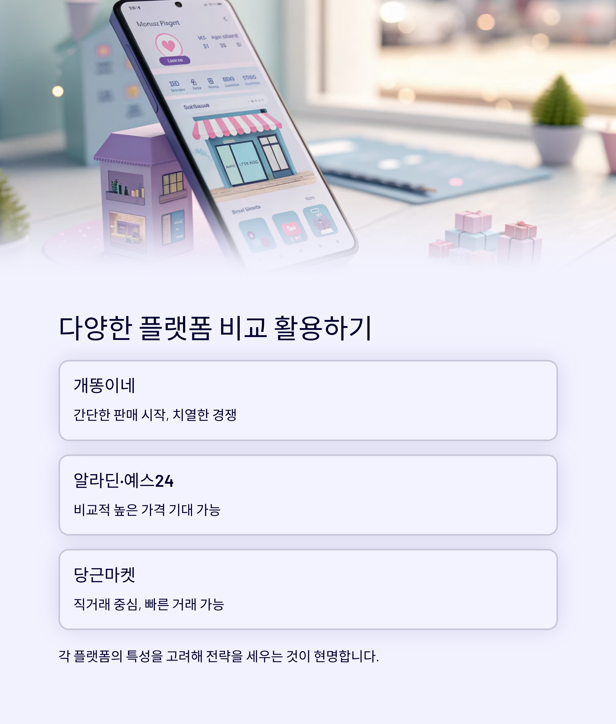 개똥이네는 간단히 판매를 시작할 수 있는 장점이 있지만, 경쟁도 치열합니다. 알라딘, 예스24는 비교적 높은 가격을 기대할 수 있고, 당근마켓은 직거래 중심으로 빠른 거래가 가능합니다. 각각의 특성을 고려해 전략을 세우는 것이 현명합니다.