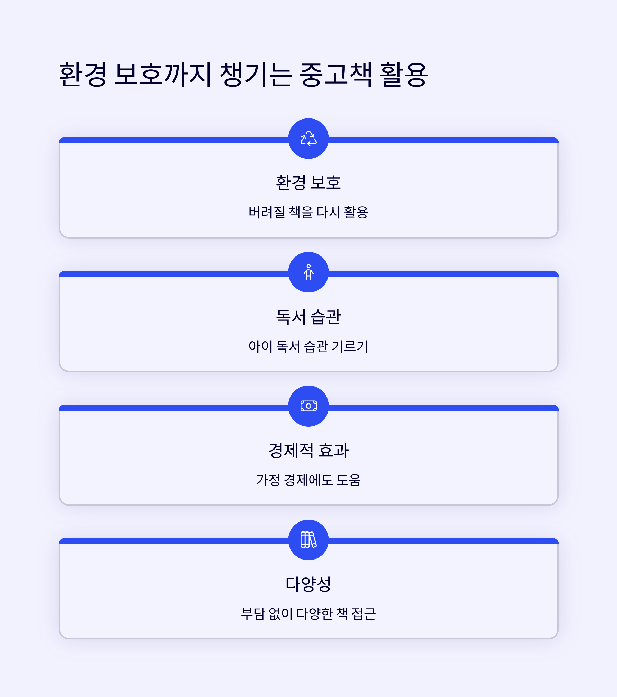 버려질 뻔한 책을 다시 사용하는 건 환경 보호에도 큰 의미가 있습니다. 아이 독서 습관을 기르는 데도 도움이 되고, 다양한 책을 부담 없이 접할 수 있어 가정 경제에도 이롭습니다. 작은 선택이지만 큰 가치를 만드는 행동이죠.