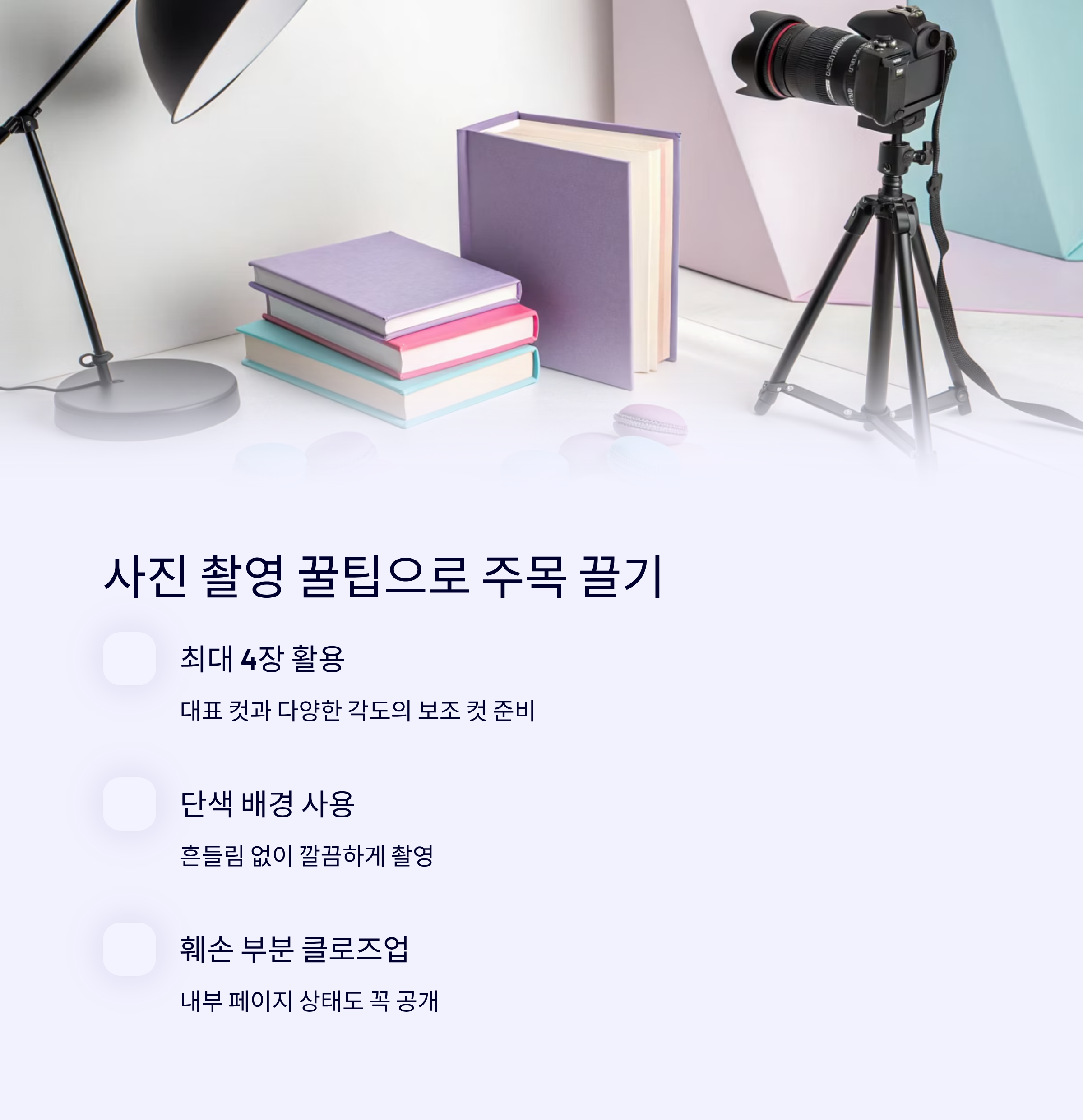 사진은 최대 4장까지 등록 가능하니 대표 컷과 다양한 각도의 보조 컷을 활용해 보세요. 단색 배경에서 흔들림 없이 촬영하면 깔끔하고 보기 좋아요. 특히 훼손된 부분은 클로즈업으로 보여주고, 내부 페이지 상태도 꼭 공개하는 것이 좋습니다.