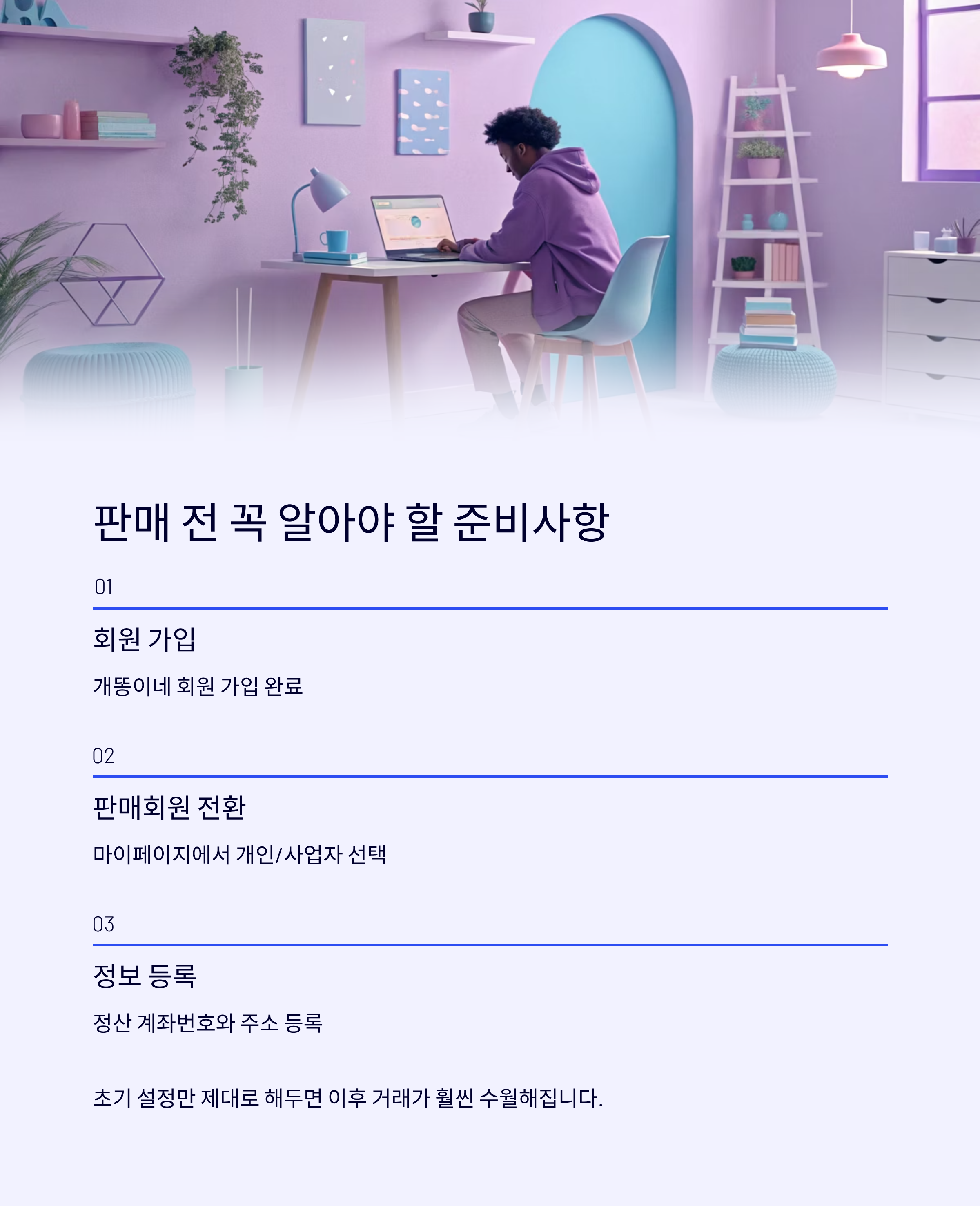 개똥이네에서 판매를 시작하려면 회원 가입 후 마이페이지에서 판매회원 전환을 해야 해요. 개인 판매자와 사업자 판매자 중 선택할 수 있으며, 정산받을 계좌번호와 주소 등록도 필수입니다. 초기 설정만 제대로 해두면 이후 거래 과정이 훨씬 수월해집니다.