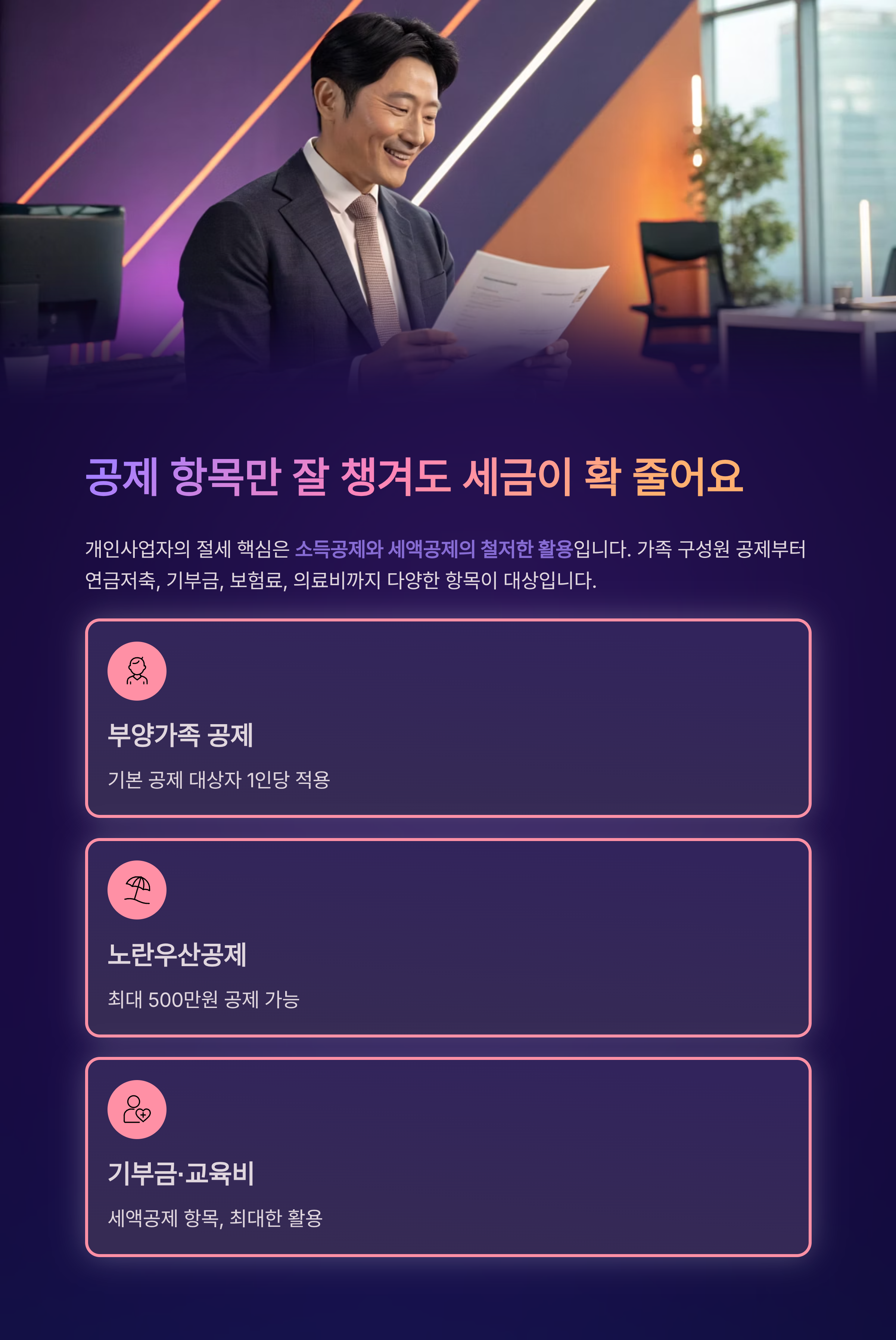 개인사업자의 절세 핵심은 소득공제와 세액공제의 철저한 활용입니다.