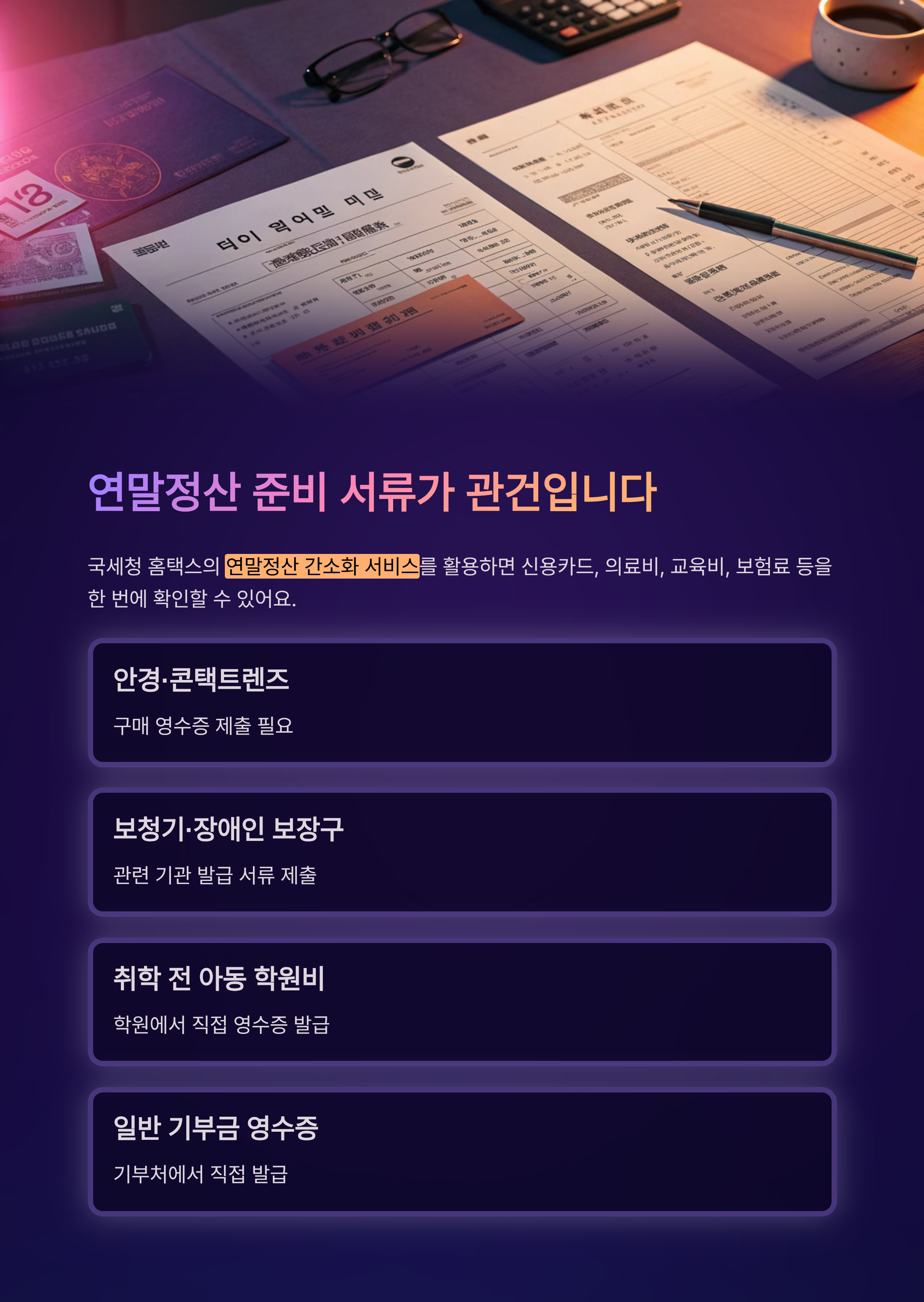 국세청 홈택스의 연말정산 간소화 서비스를 활용하면 필요한 대부분의 서류를 한 번에 확인할 수 있어요.