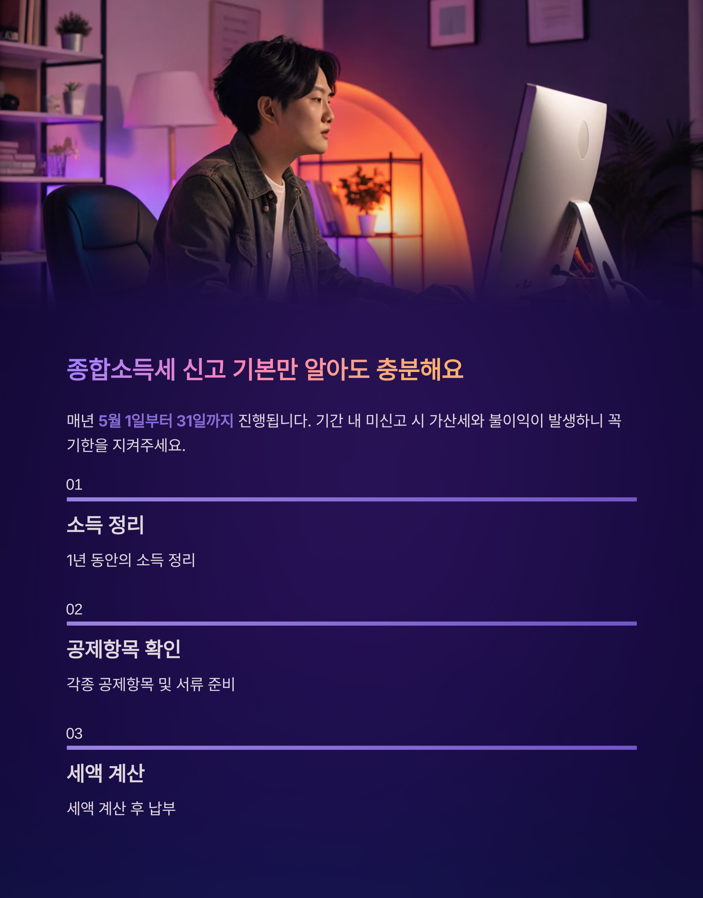 종합소득세 신고는 매년 5월 1일부터 31일까지 진행됩니다.