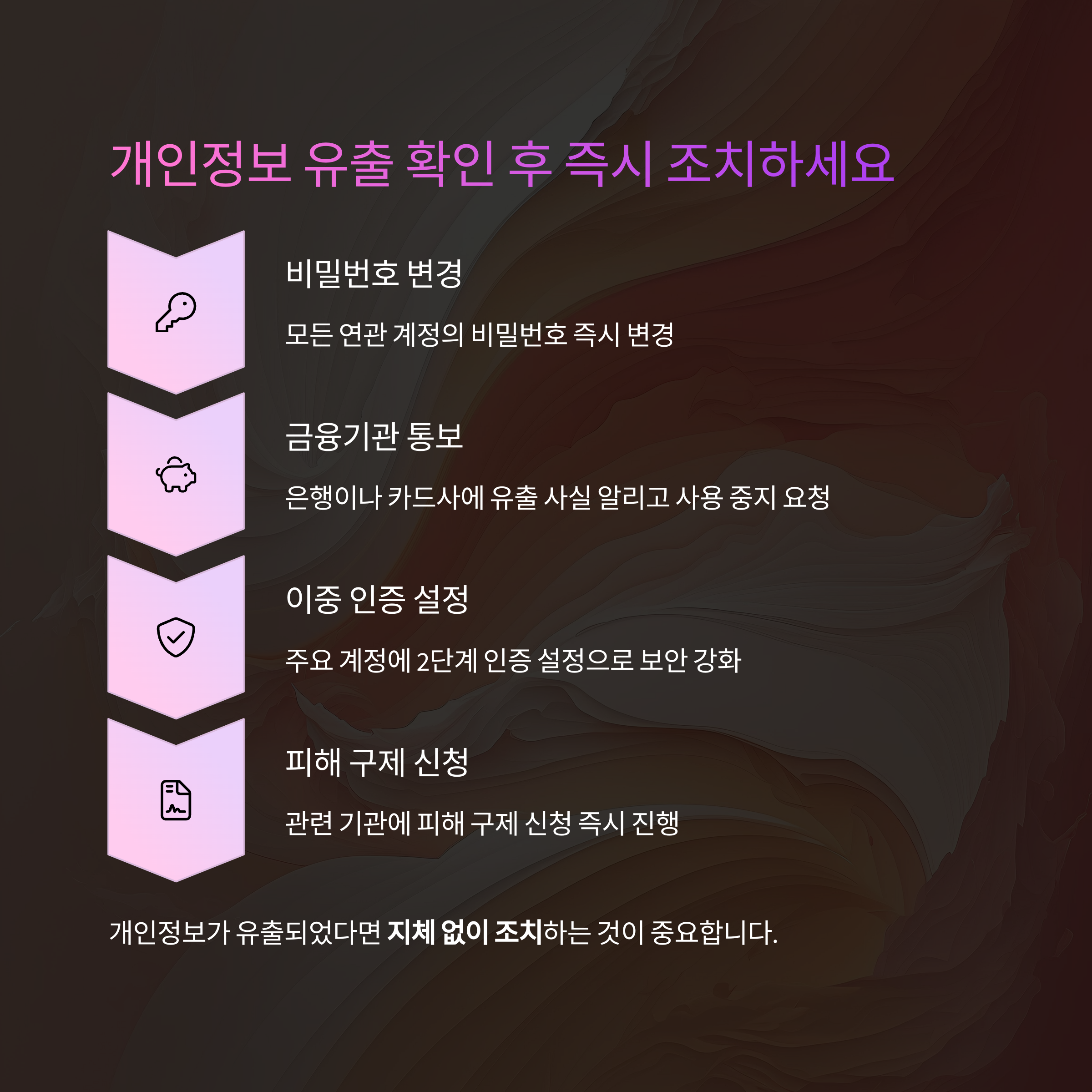금융 정보가 포함된 경우 해당 은행이나 카드사에 유출 사실을 알리고 사용 중지를 요청해야 하며, 피해 구제 신청도 즉시 진행하는 것이 중요합니다.