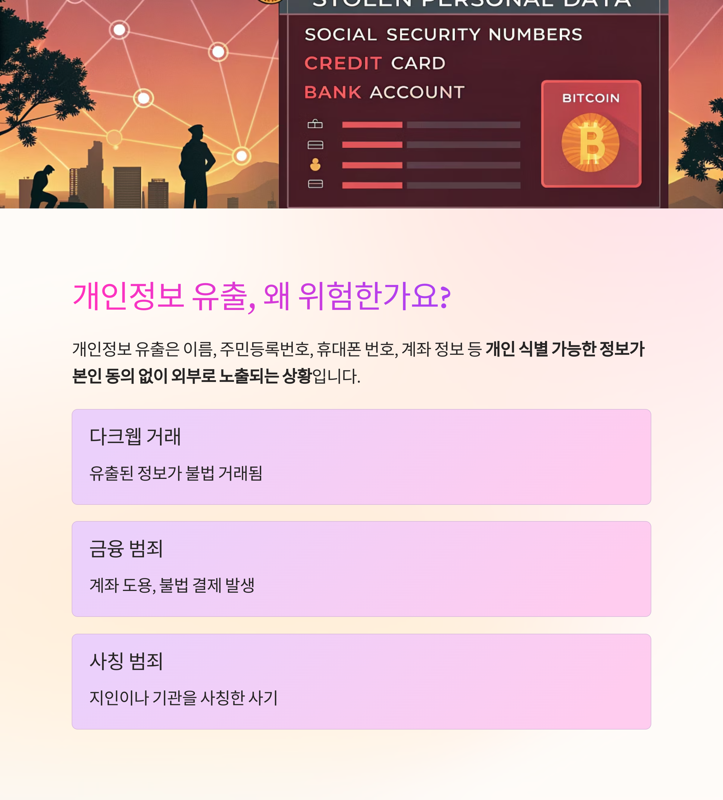 개인정보는 한 번 유출되면 되돌릴 수 없고, 피해는 오랫동안 이어질 수 있습니다.