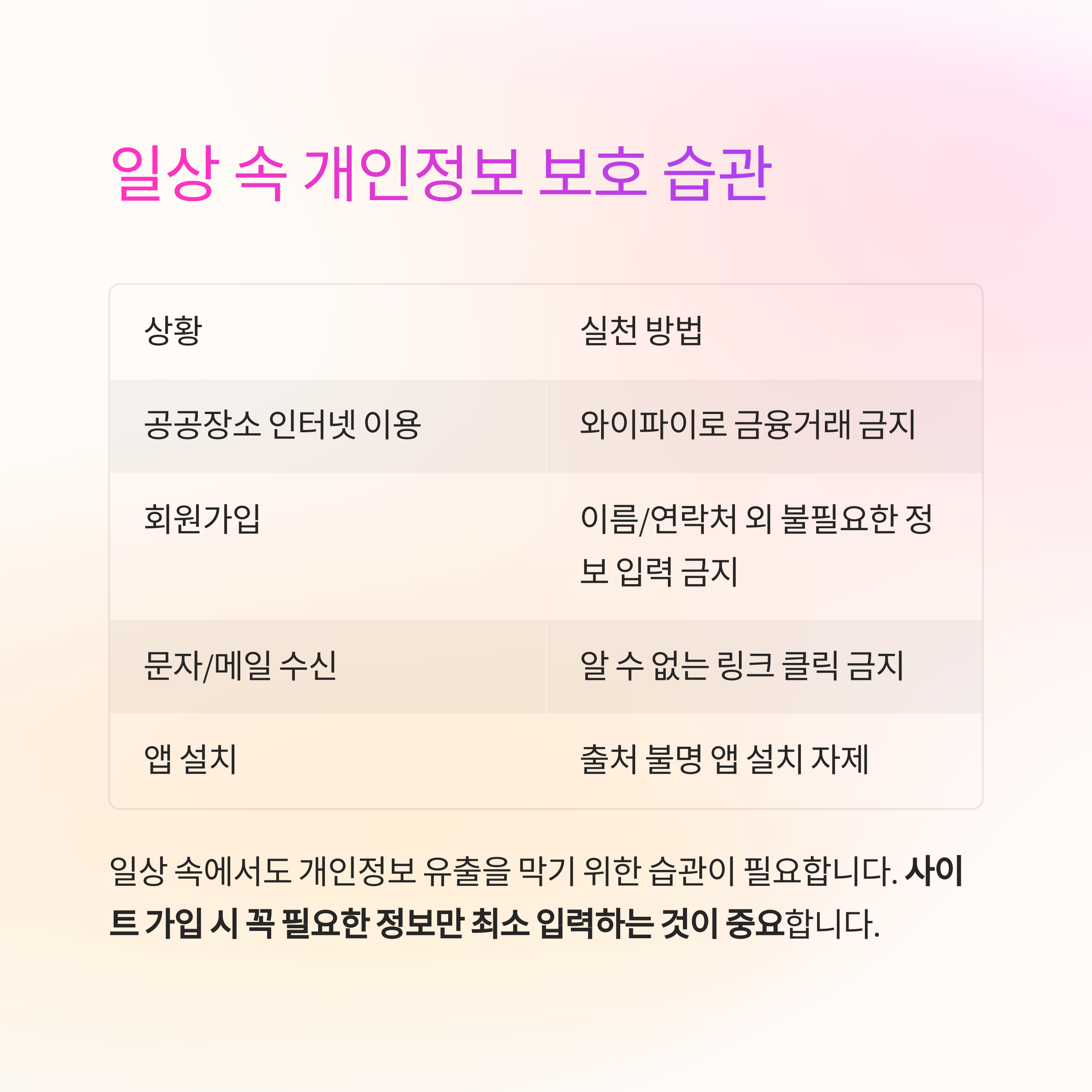 일상 속에서도 개인정보 유출을 막기 위한 습관이 필요합니다.