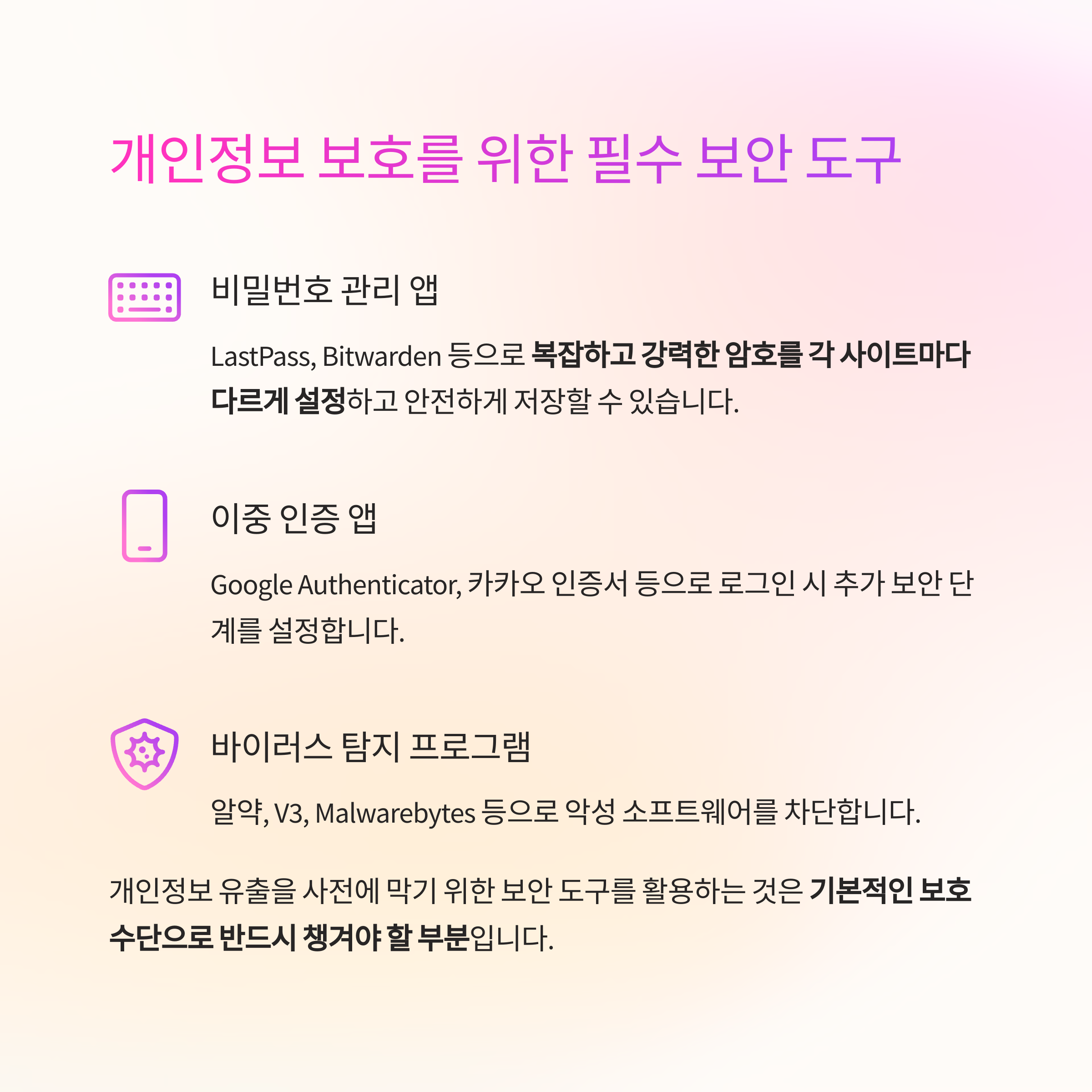 | 비밀번호 관리 | LastPass, Bitwarden 등 |