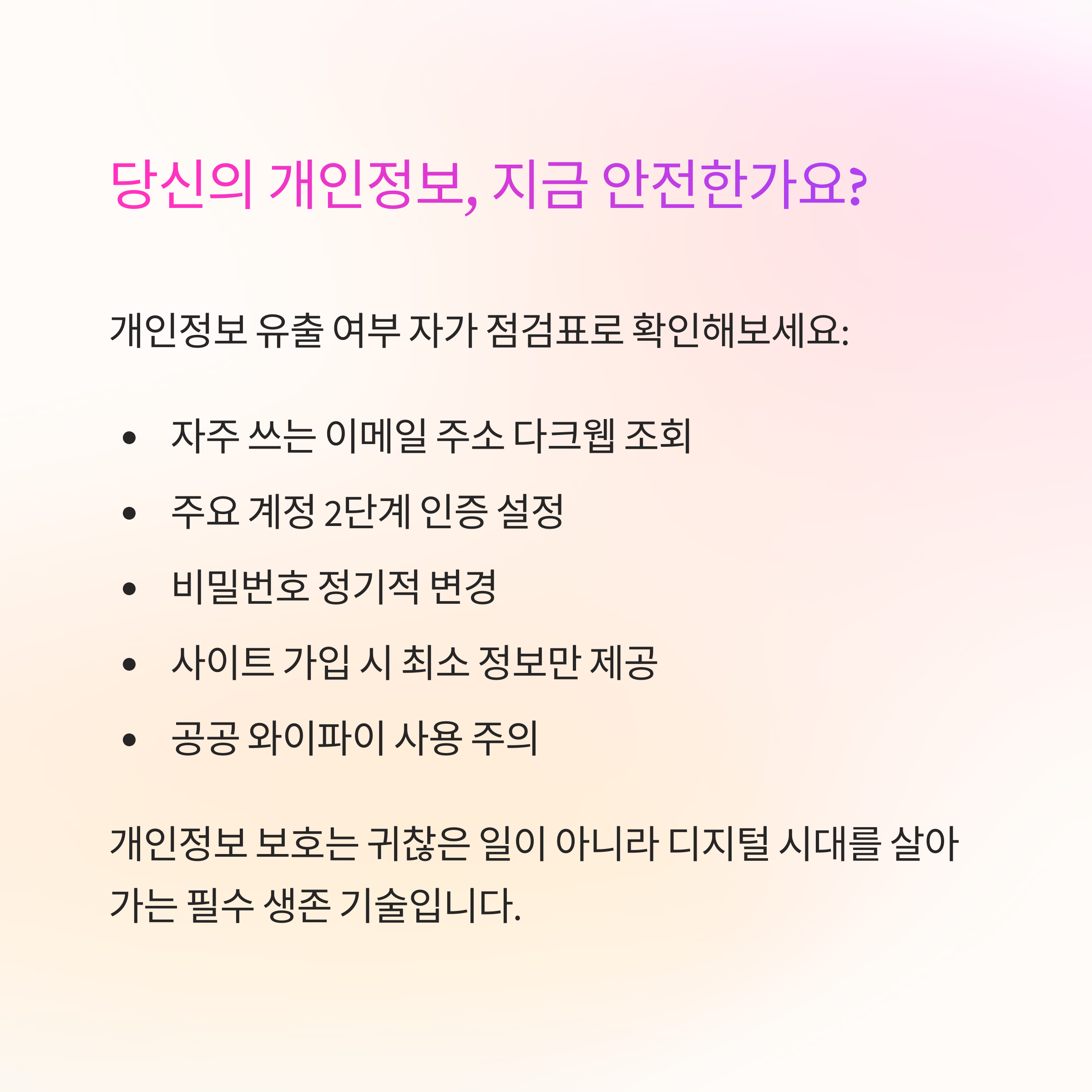 때문에 한 달에 한 번만이라도 주요 계정의 접속 기록, 비밀번호 점검, 유출 여부 확인을 하는 것이 현명한 정보관리 습관입니다.