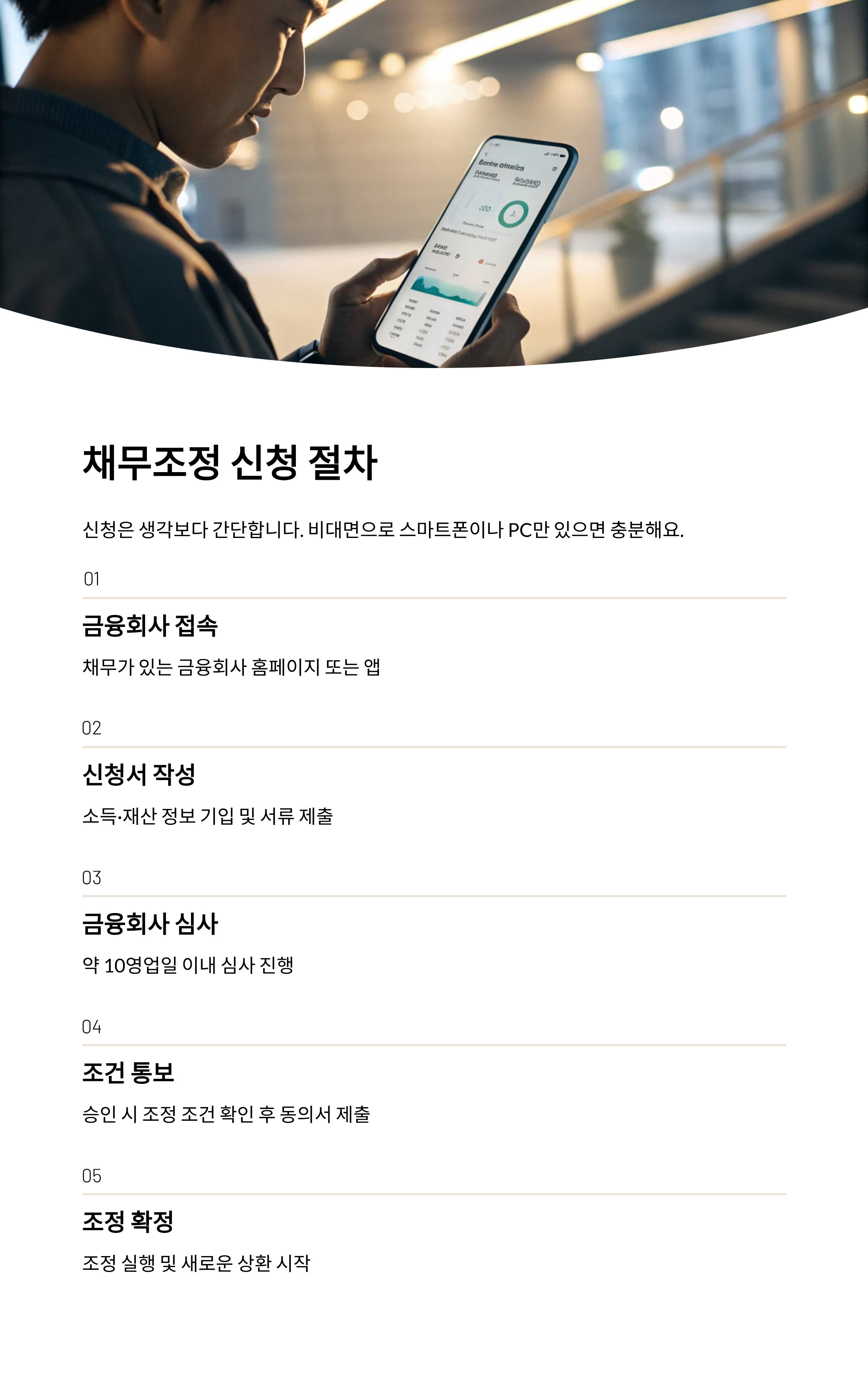 채무조정은 빚을 없애주는 것이 아닌, 감당 가능한 방식으로 다시 설 수 있도록 돕는 제도입니다.