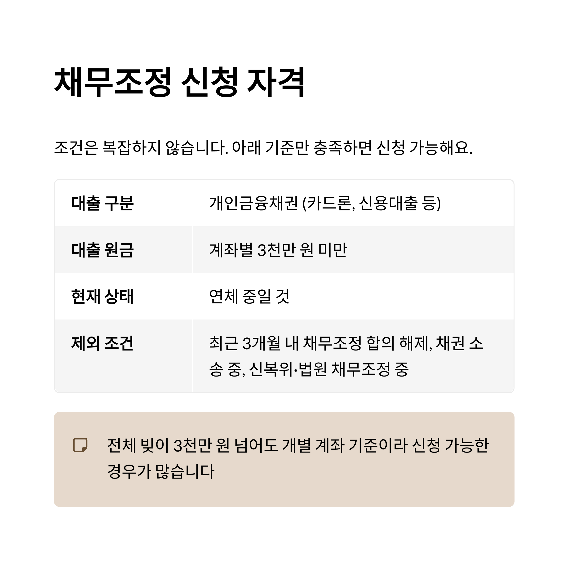 | 제외 조건 | 최근 3개월 내 채무조정 합의 해제, 채권 관련 소송 중, 신복위·법원 채무조정 중 |