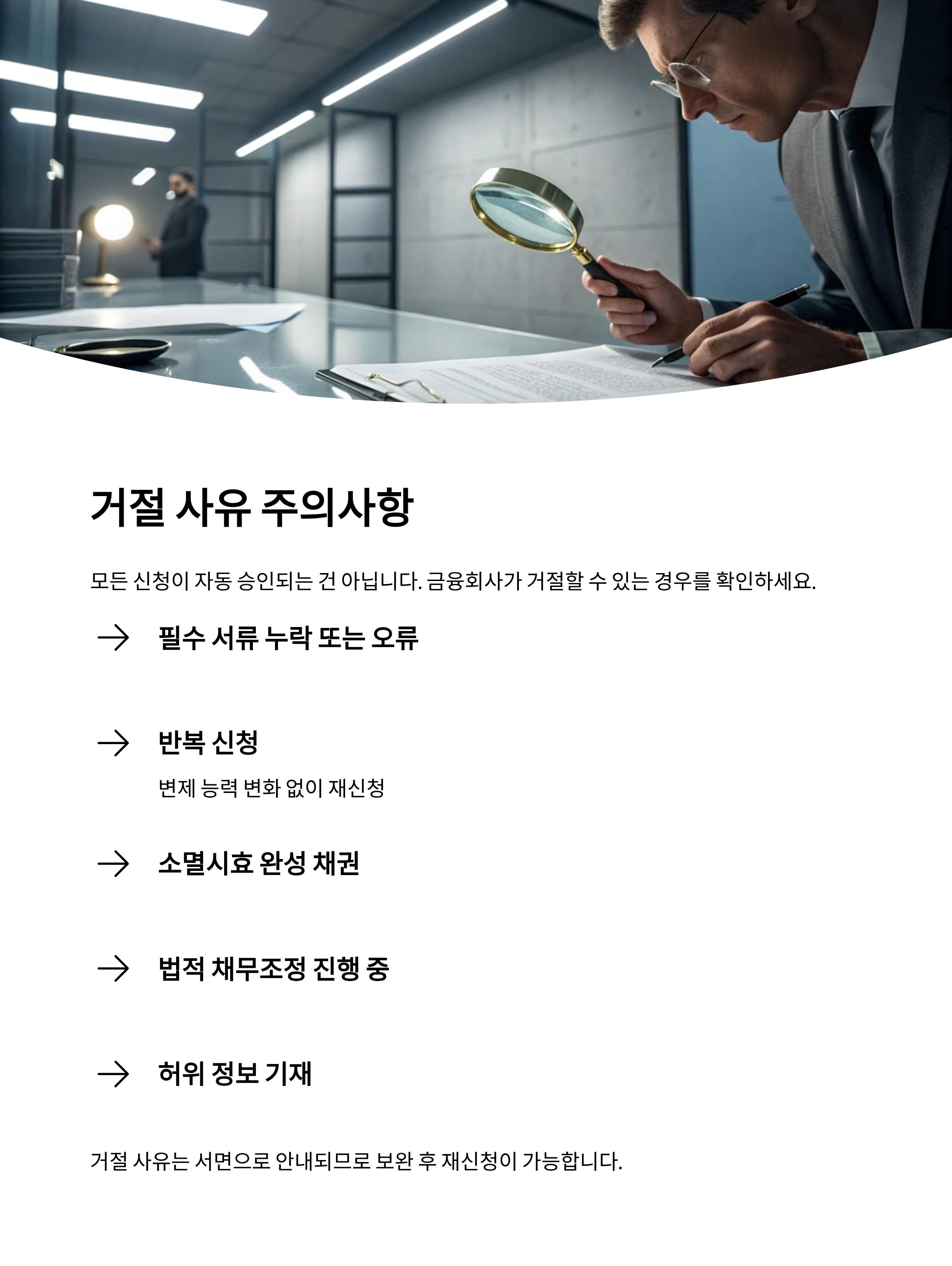 모든 신청이 자동 승인되는 건 아니에요. 금융회사가 거절할 수 있는 경우는 다음과 같습니다.