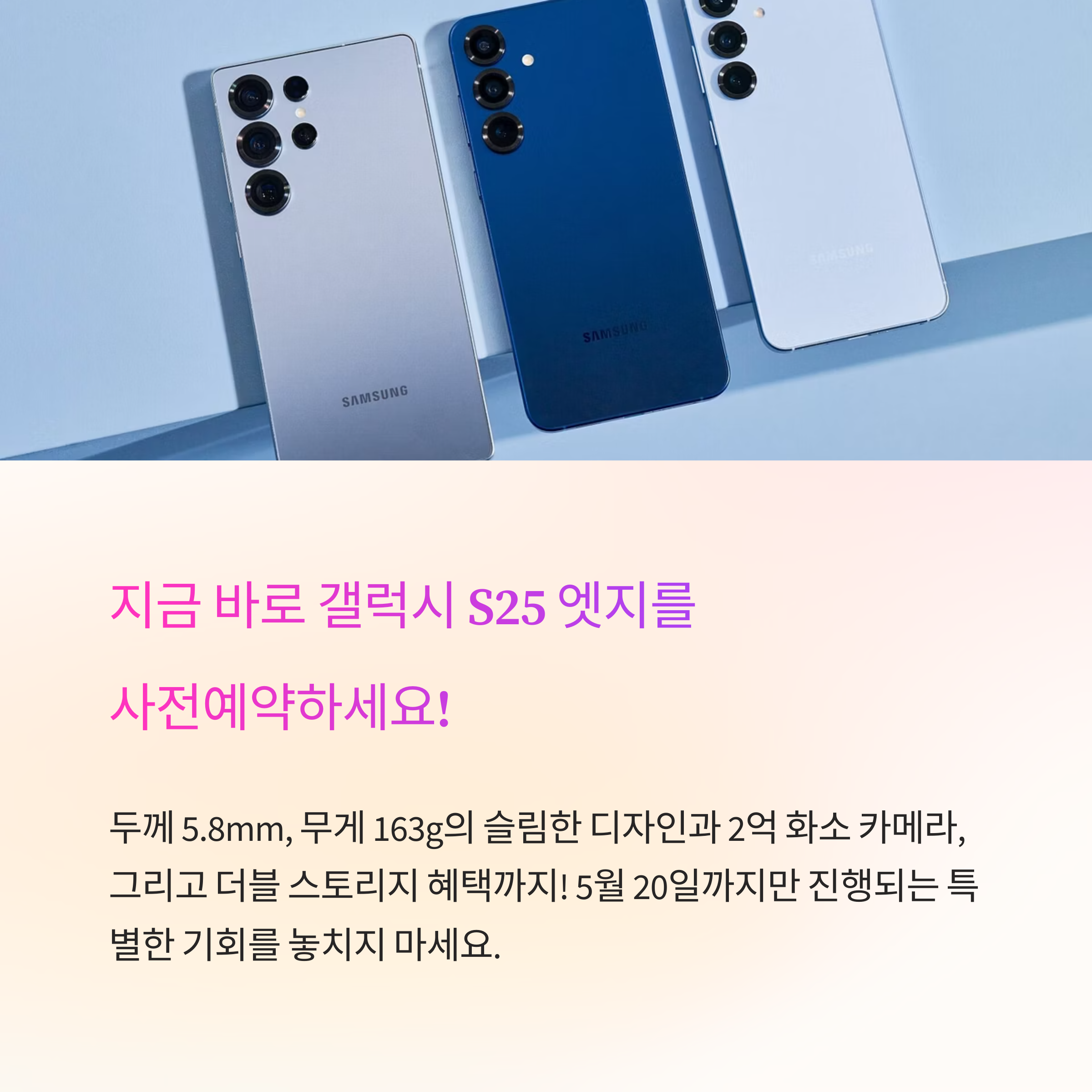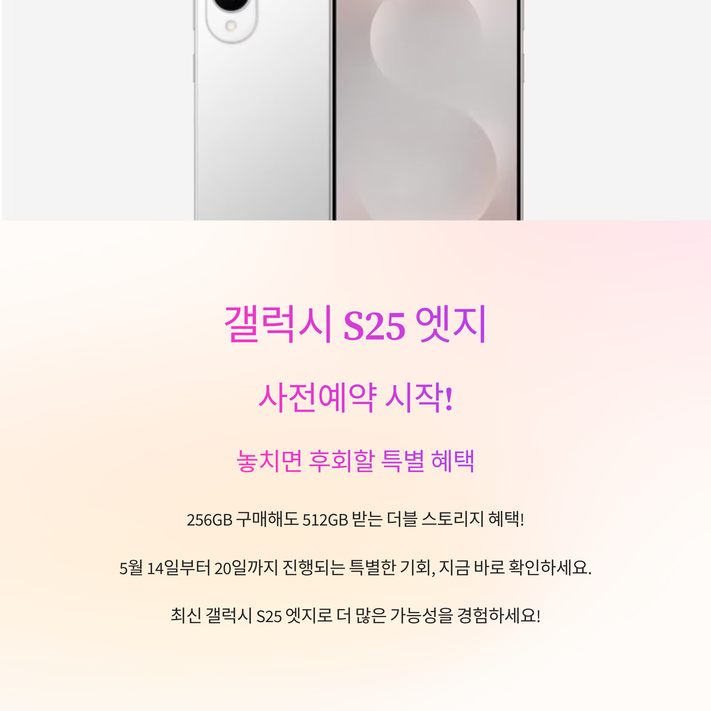 갤럭시 S25 엣지 사전예약은 삼성닷컴, 이동통신사 온라인몰, 오프라인 매장 등에서 진행됩니다. 예약 시 구매처에 따라 취급 용량이 상이할 수 있으므로 확인이 필요합니다.
