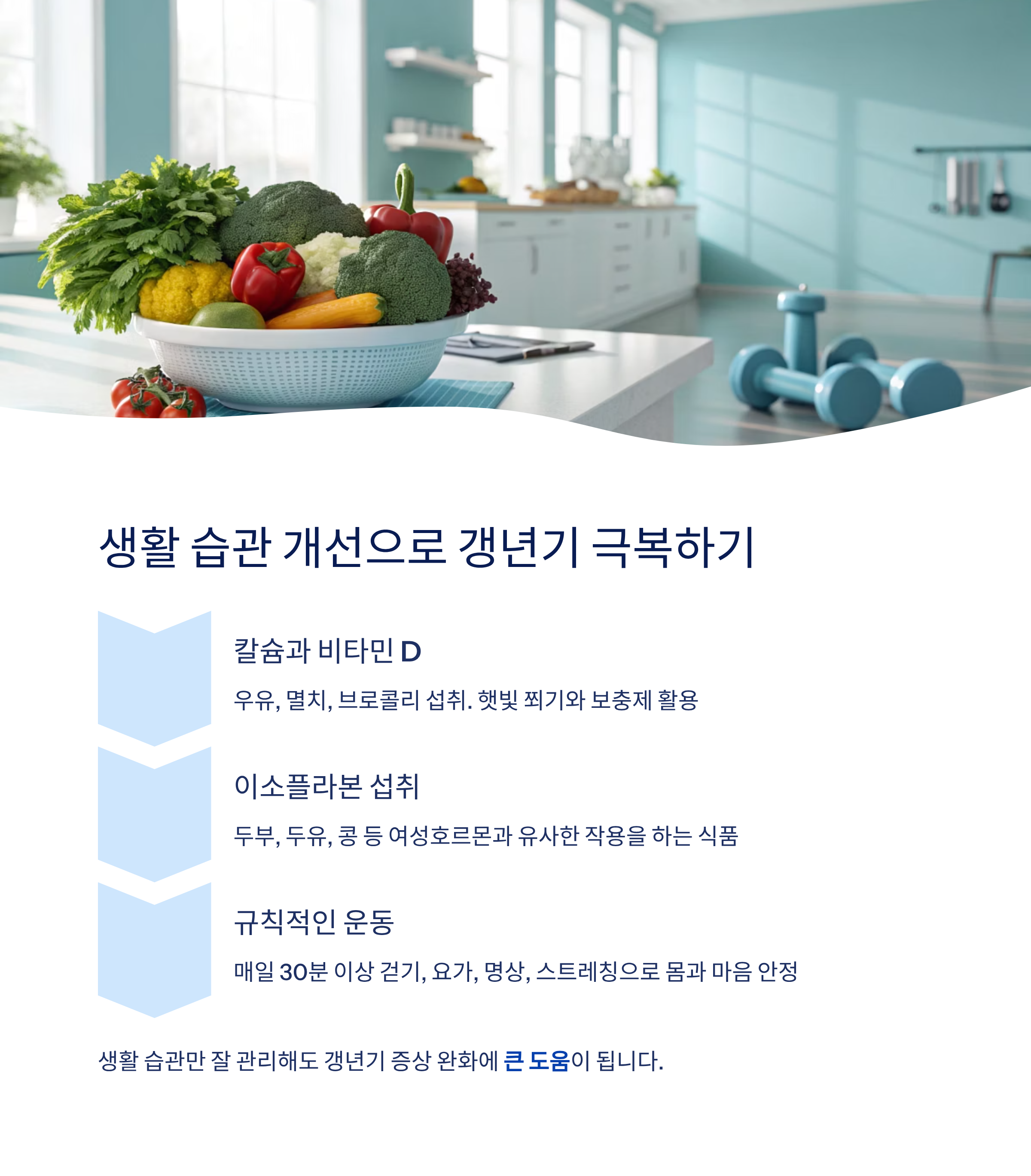 생활 습관만 잘 관리해도 갱년기 증상 완화에 큰 도움이 돼요.