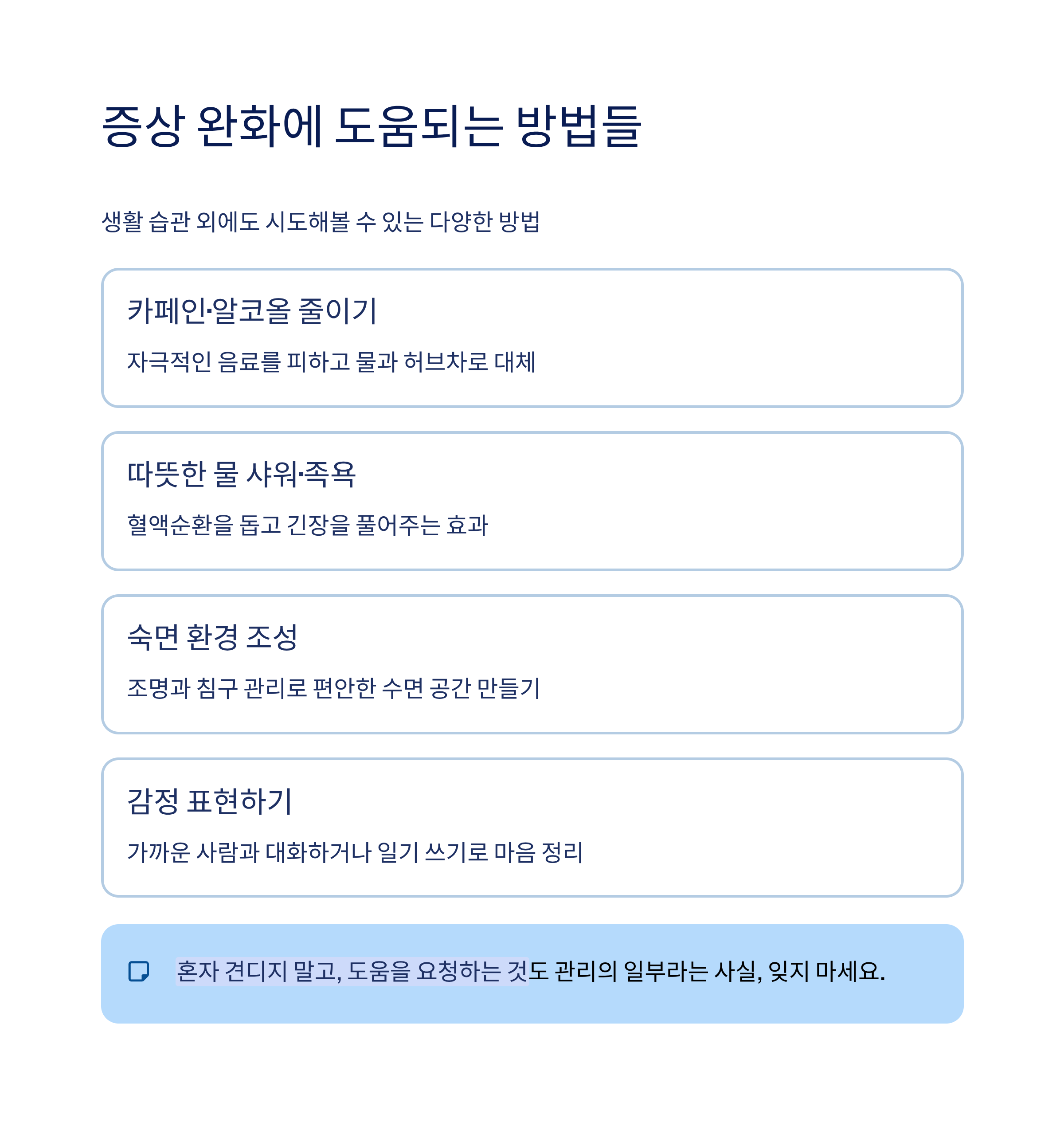 이런 방법들은 몸뿐 아니라 마음의 안정을 찾는 데에도 중요해요.