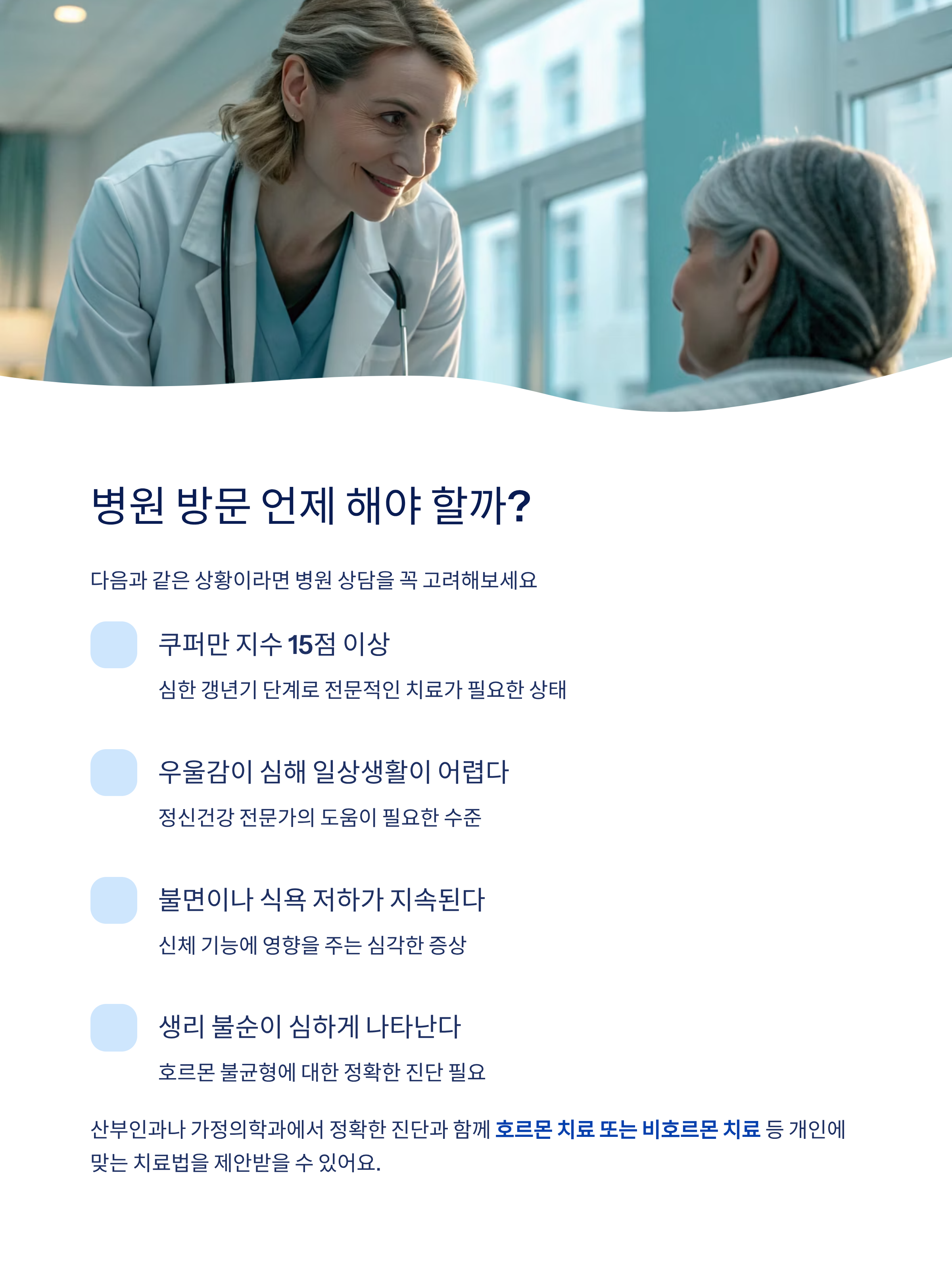 | 15점 이상 | 심한 갱년기 | 병원 상담 필요, 적극적인 대처 |