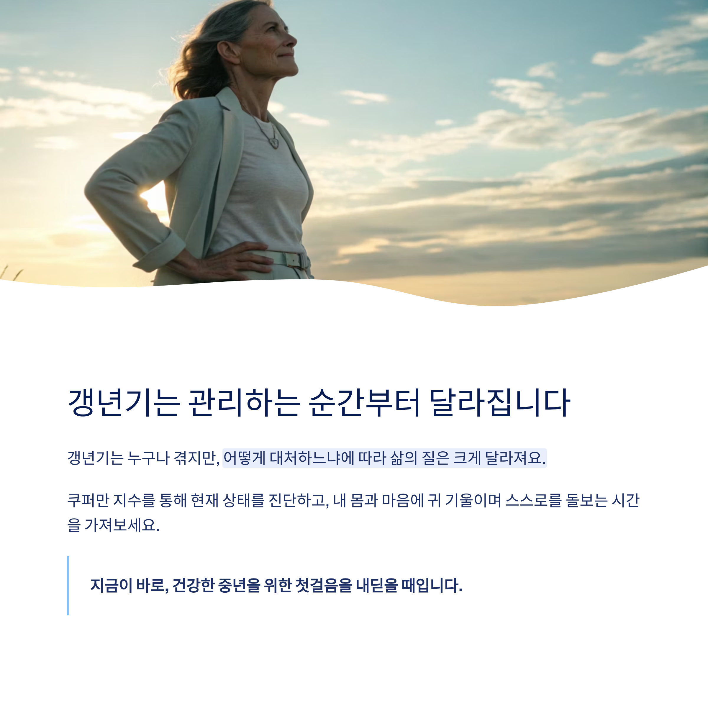 갱년기는 누구나 겪지만, 어떻게 대처하느냐에 따라 삶의 질은 크게 달라져요.