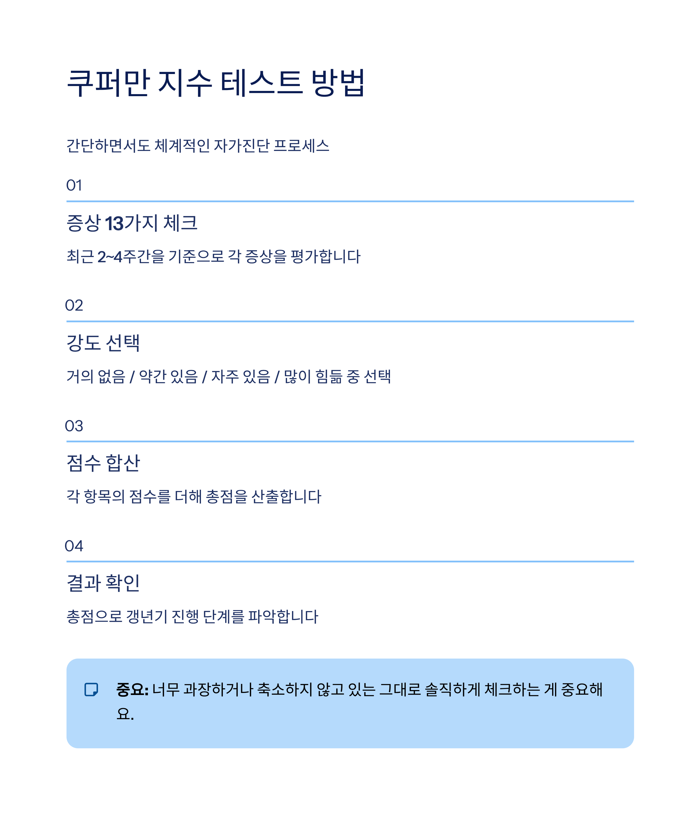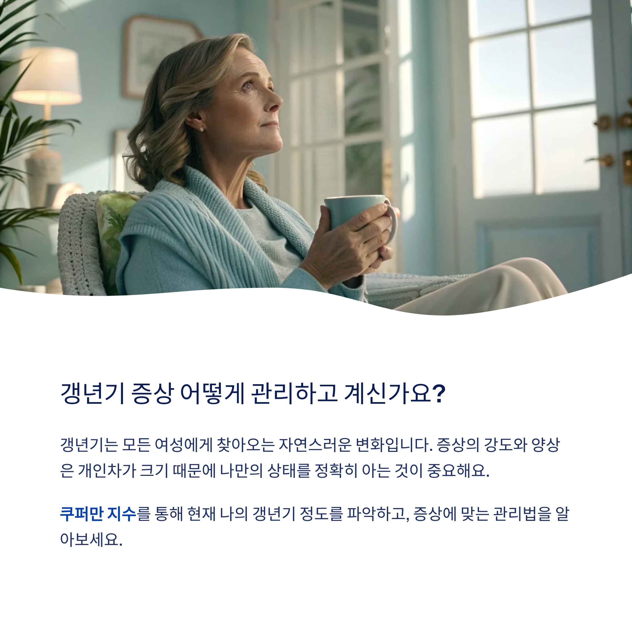 갱년기는 모든 여성에게 찾아오는 자연스러운 변화입니다. 하지만 증상의 강도와 양상은 개인차가 크기 때문에 나만의 상태를 정확히 아는 것이 중요해요. 이때 활용할 수 있는 것이 바로 쿠퍼만 지수입니다. 자가진단을 통해 현재 나의 갱년기 정도를 파악하고, 증상에 맞는 관리법을 알아보며 건강한 중년을 준비해보세요.
