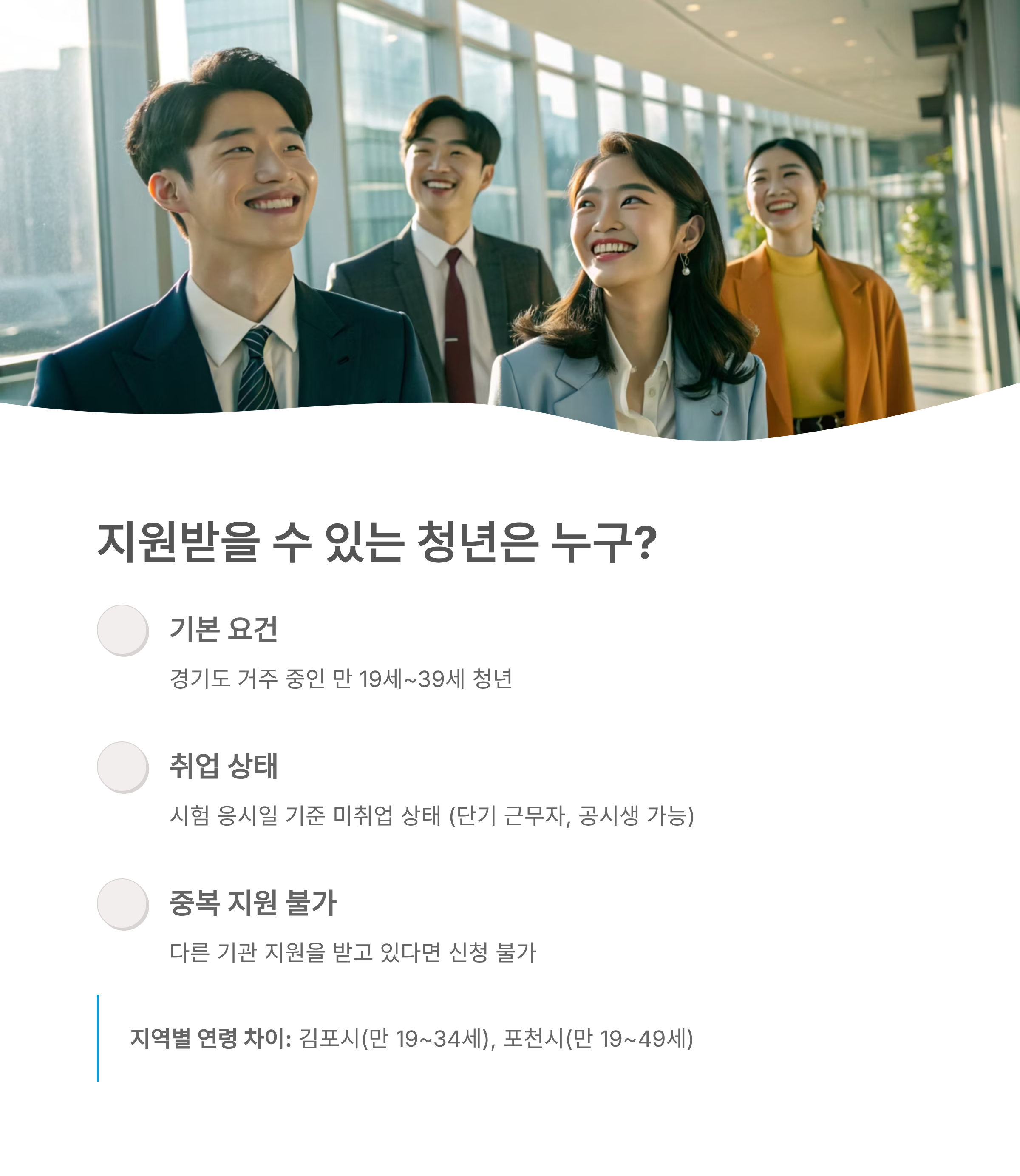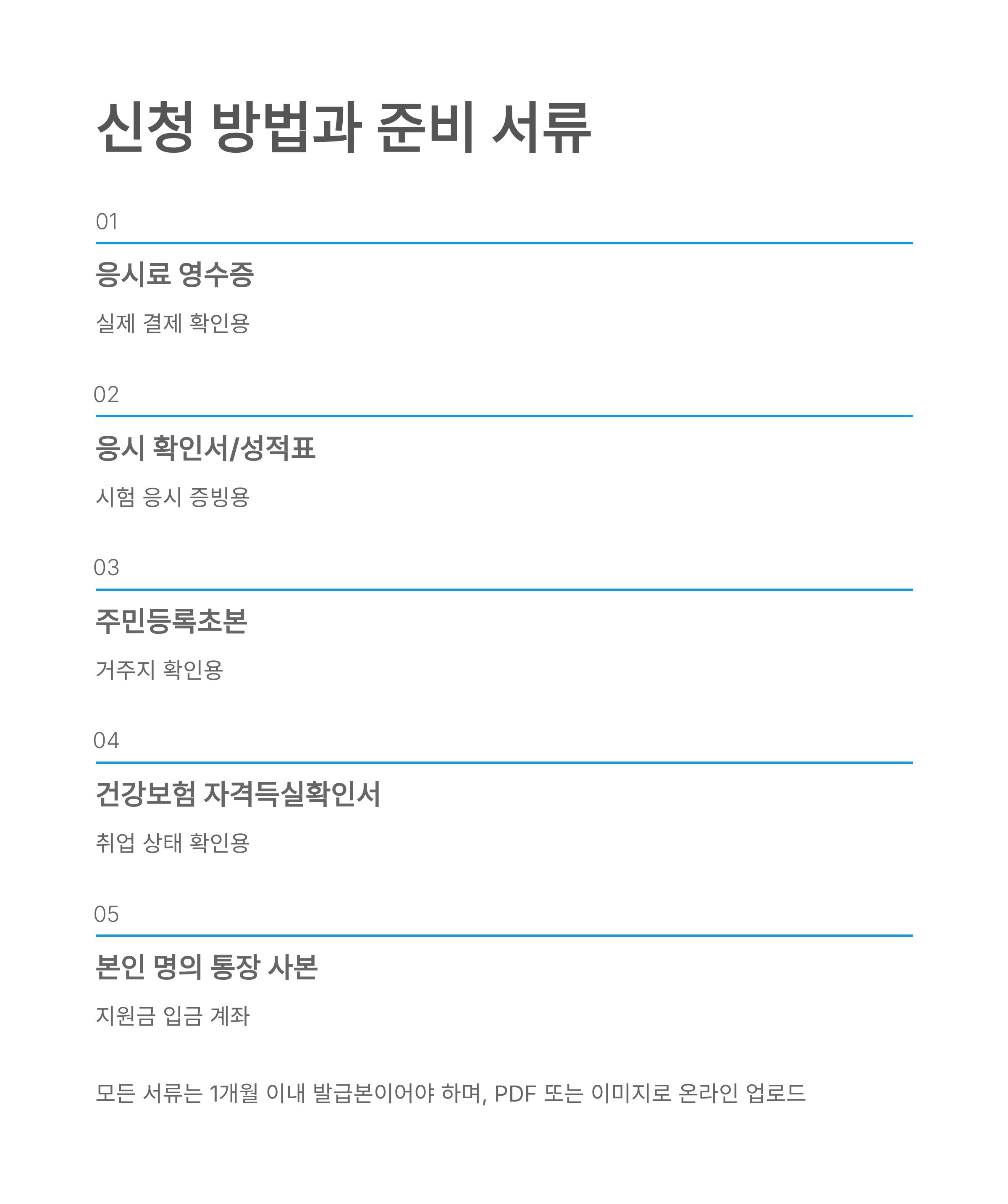 시험 응시일 기준으로 미취업 상태여야 하며, 단기 근무자나 공시생도 신청 가능해요. 단, 중복 지원은 불가하니 다른 기관 지원을 받고 있다면 주의해야 해요.