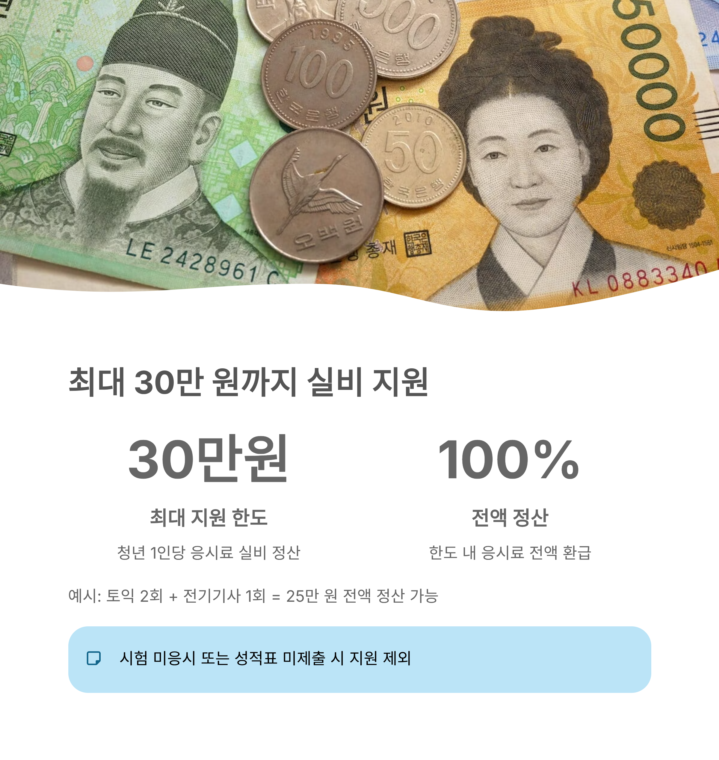 청년 1인당 최대 30만 원 한도 내에서 응시료 실비 정산이 가능해요.