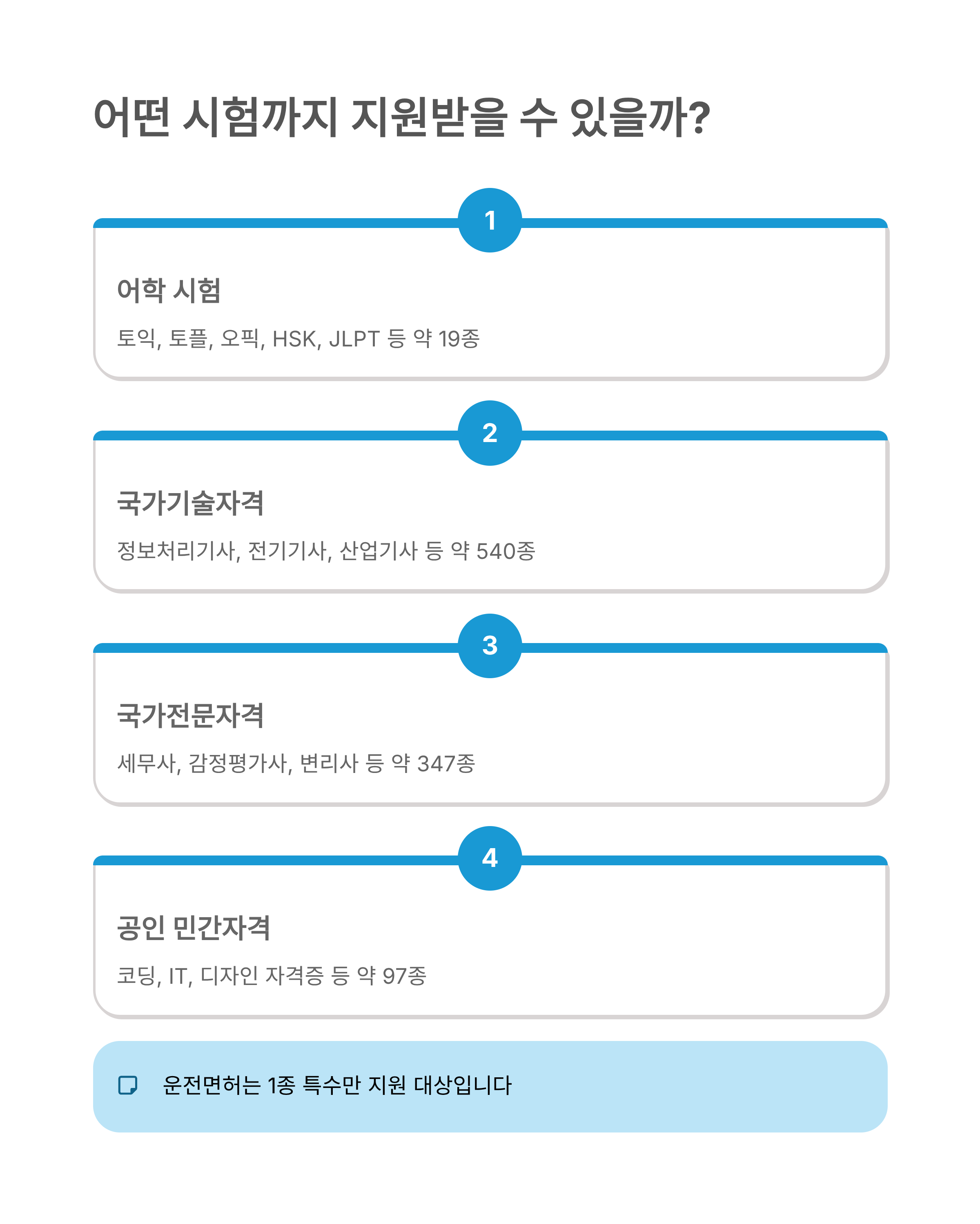 지원 시험의 범위가 상당히 넓어요. 시험 응시 계획이 있다면, 거의 대부분 지원이 된다고 봐도 무방해요.