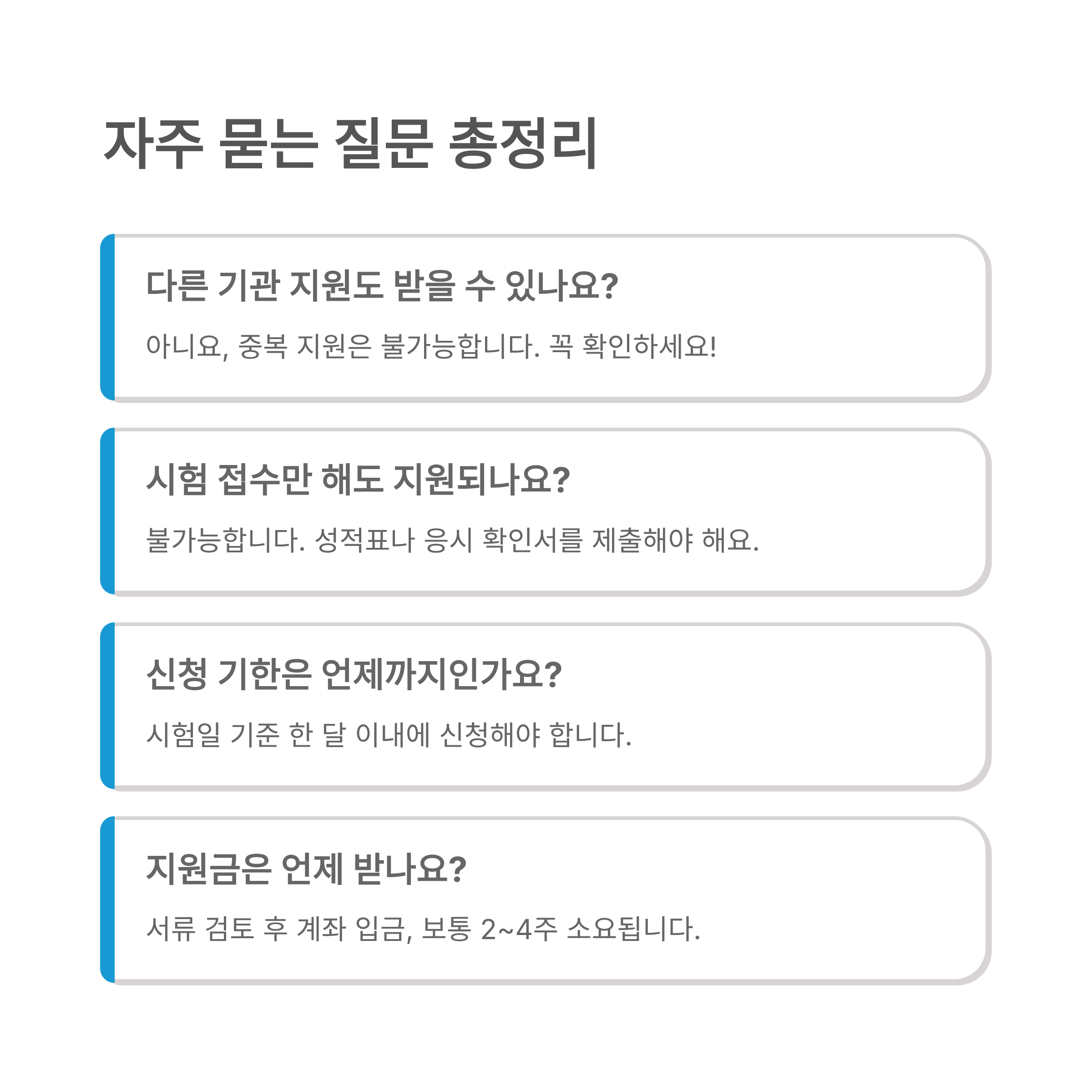 | 다른 기관에서 지원받은 시험도 신청 가능한가요? | 아니요, 중복 지원은 불가해요. 꼭 확인하세요! |