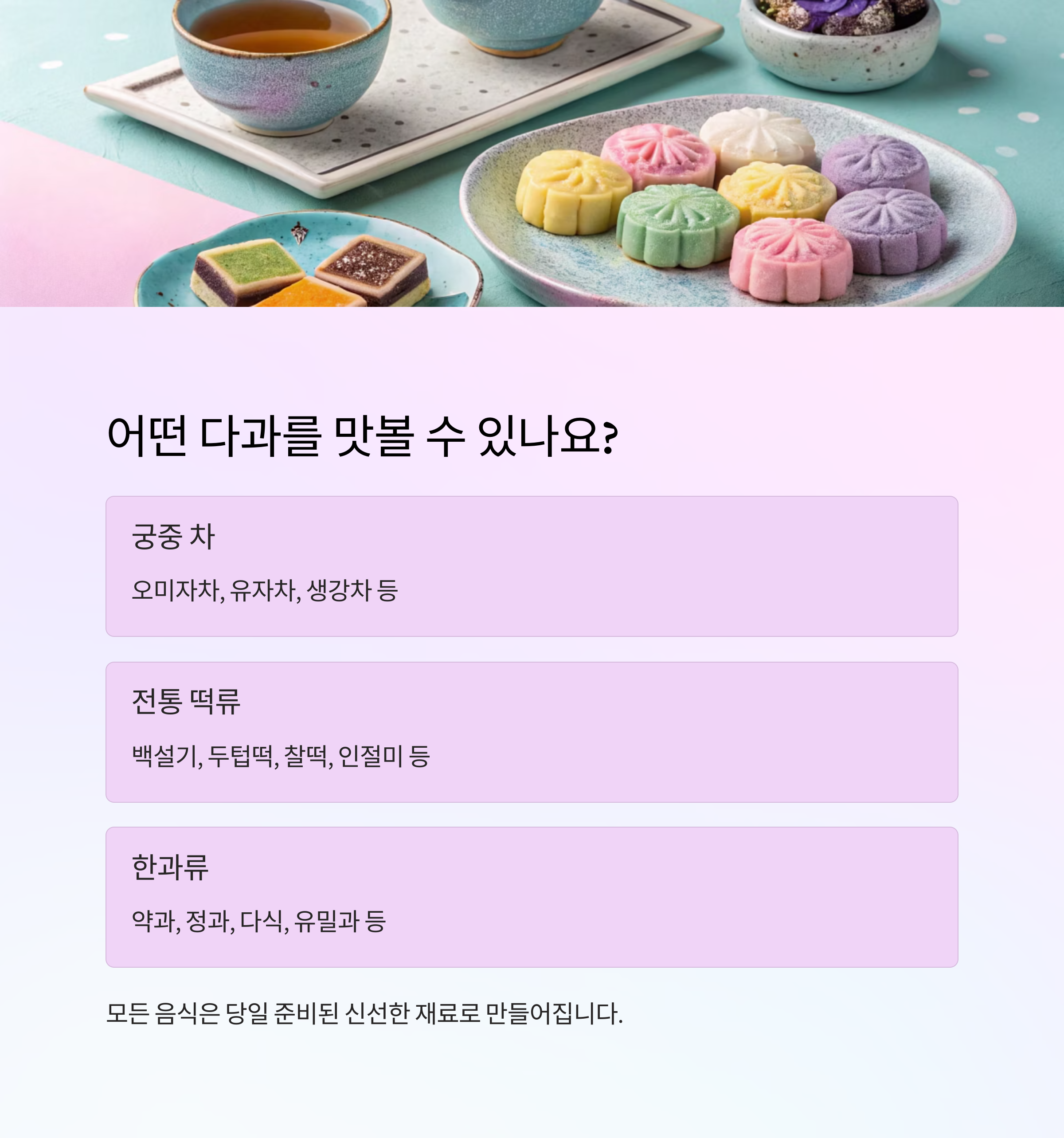 실제 조선식 궁중 다과를 직접 체험하고 시식할 수 있도록 꾸며져 있습니다.