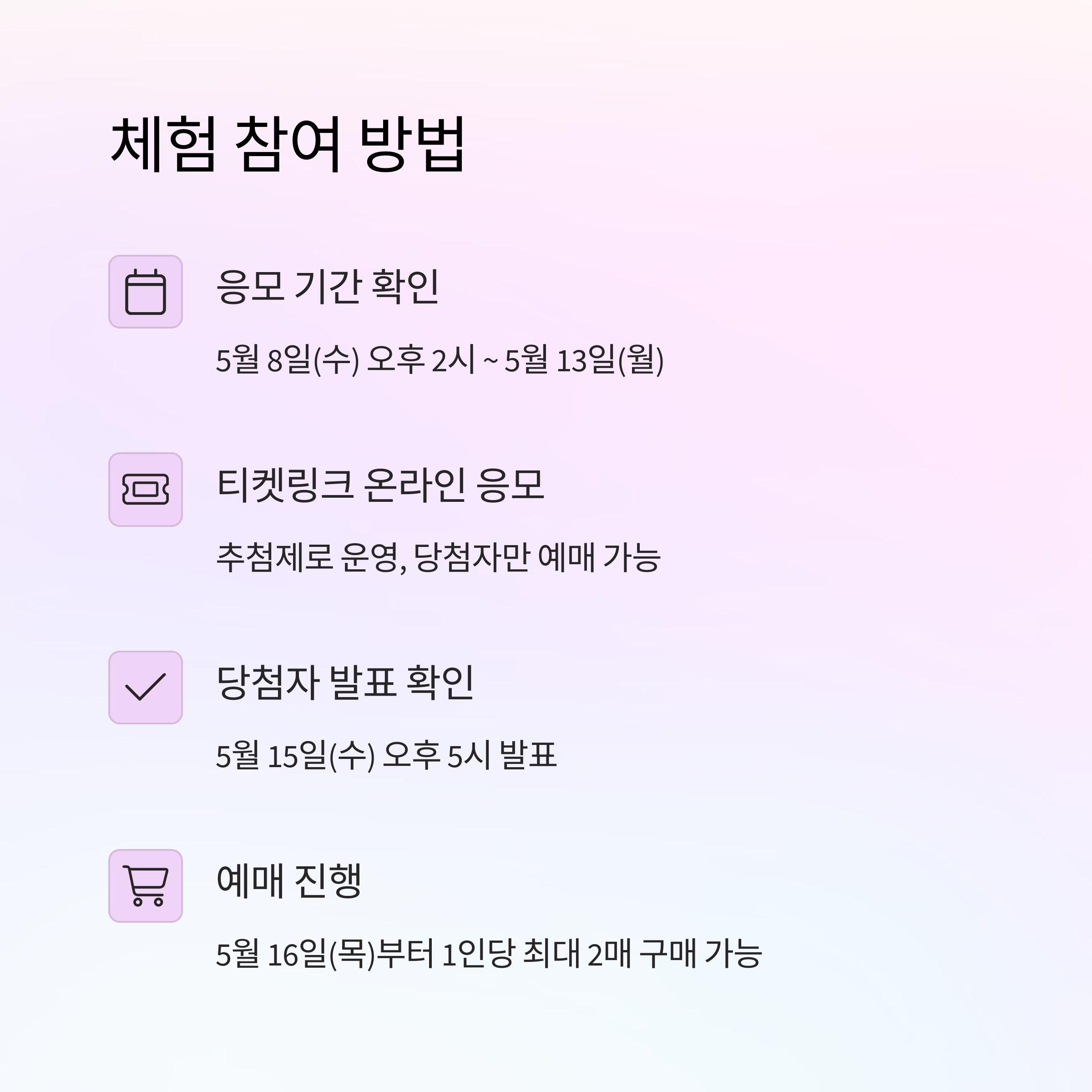 | 응모 방식 | 추첨제: 사전 응모 → 당첨 발표 → 예매 가능 |