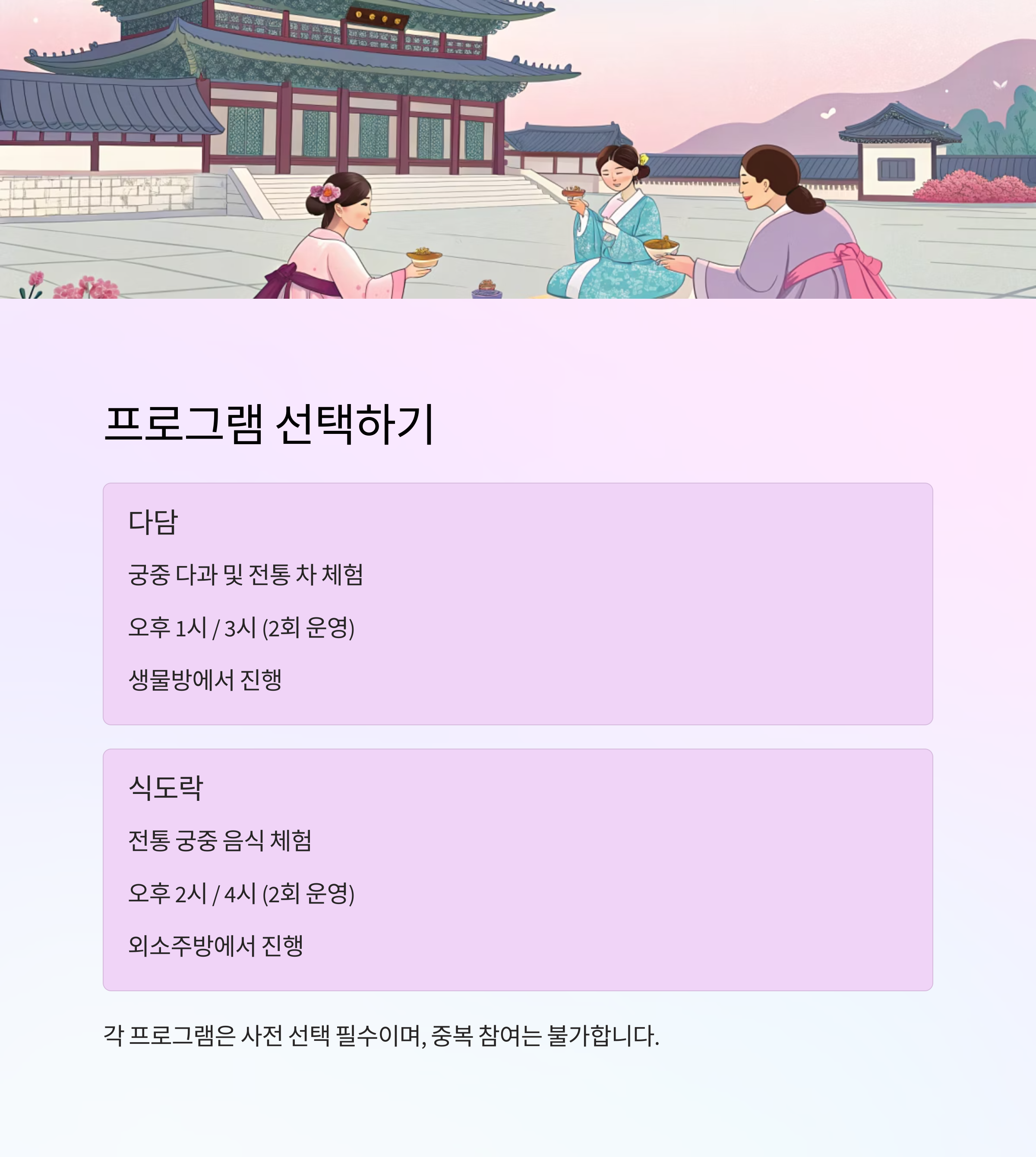 | 프로그램 선택 | 다담(생과방 다과 체험) 또는 식도락 중 택 1 |