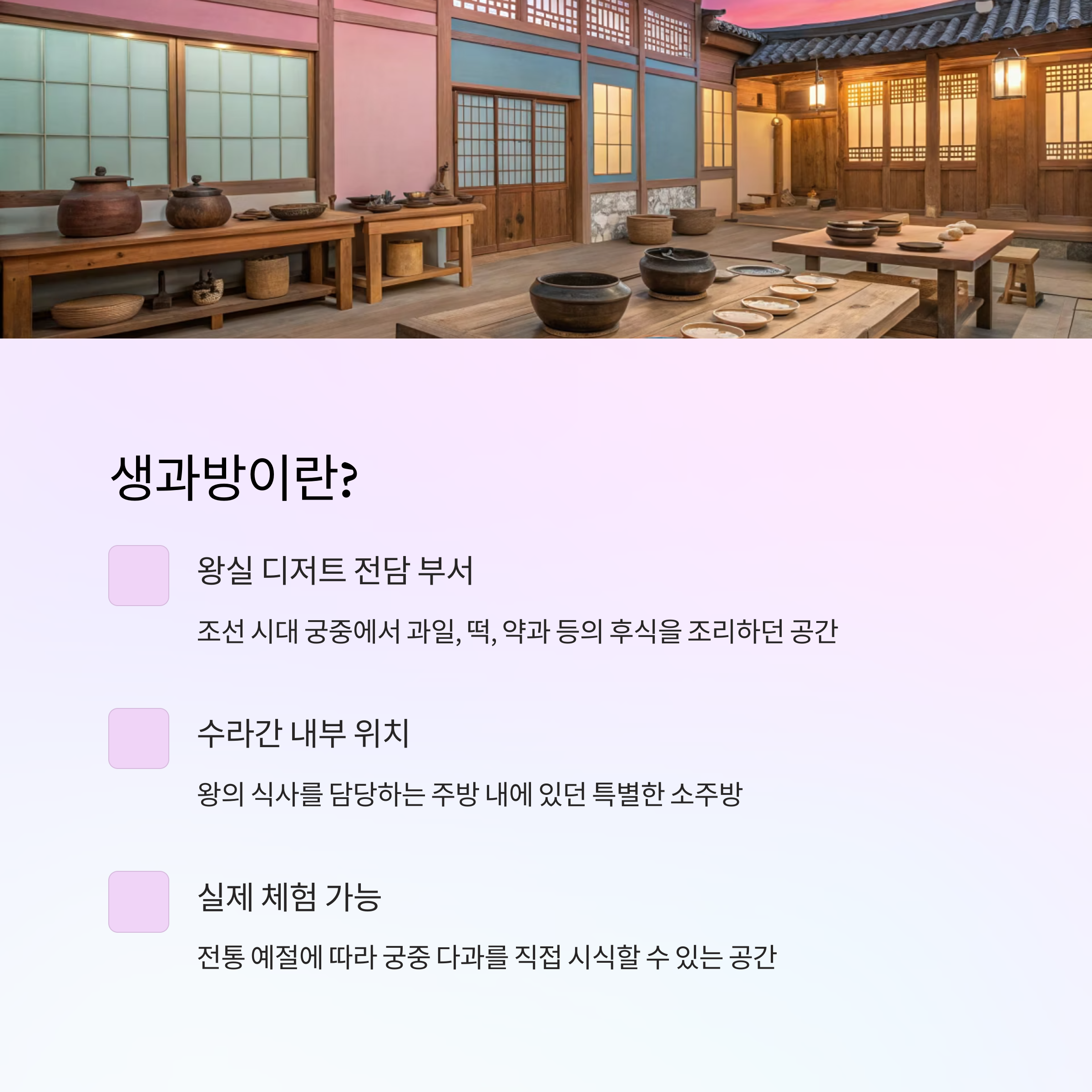 ‘생과방’은 조선 시대 궁중에서 과일, 떡, 약과 등의 후식을 조리하던 전담 부서였습니다.