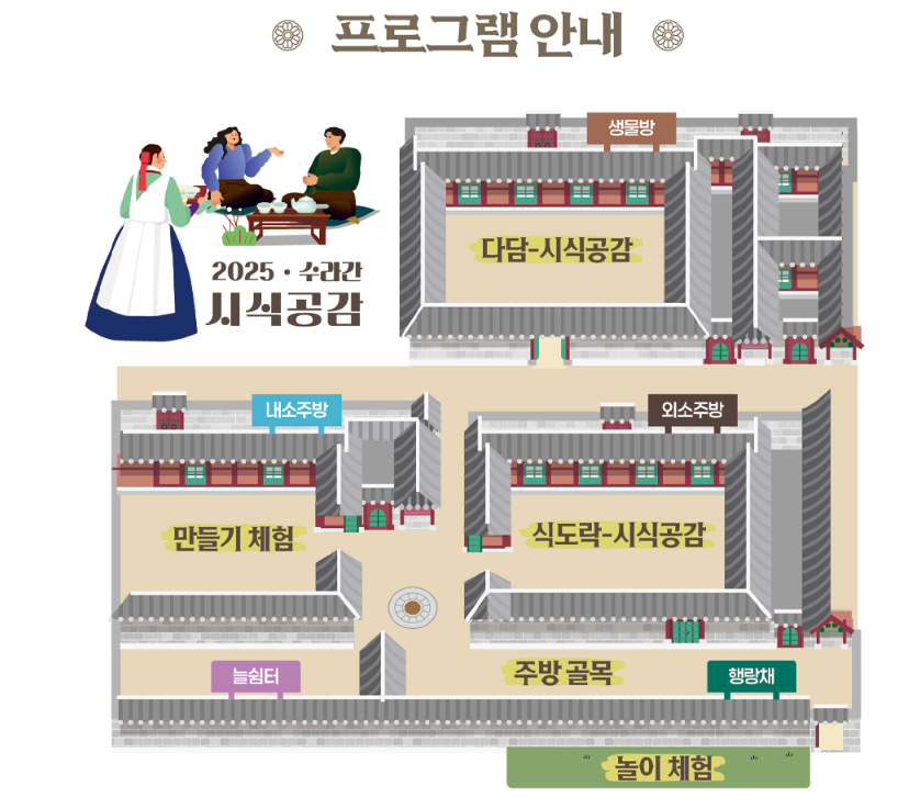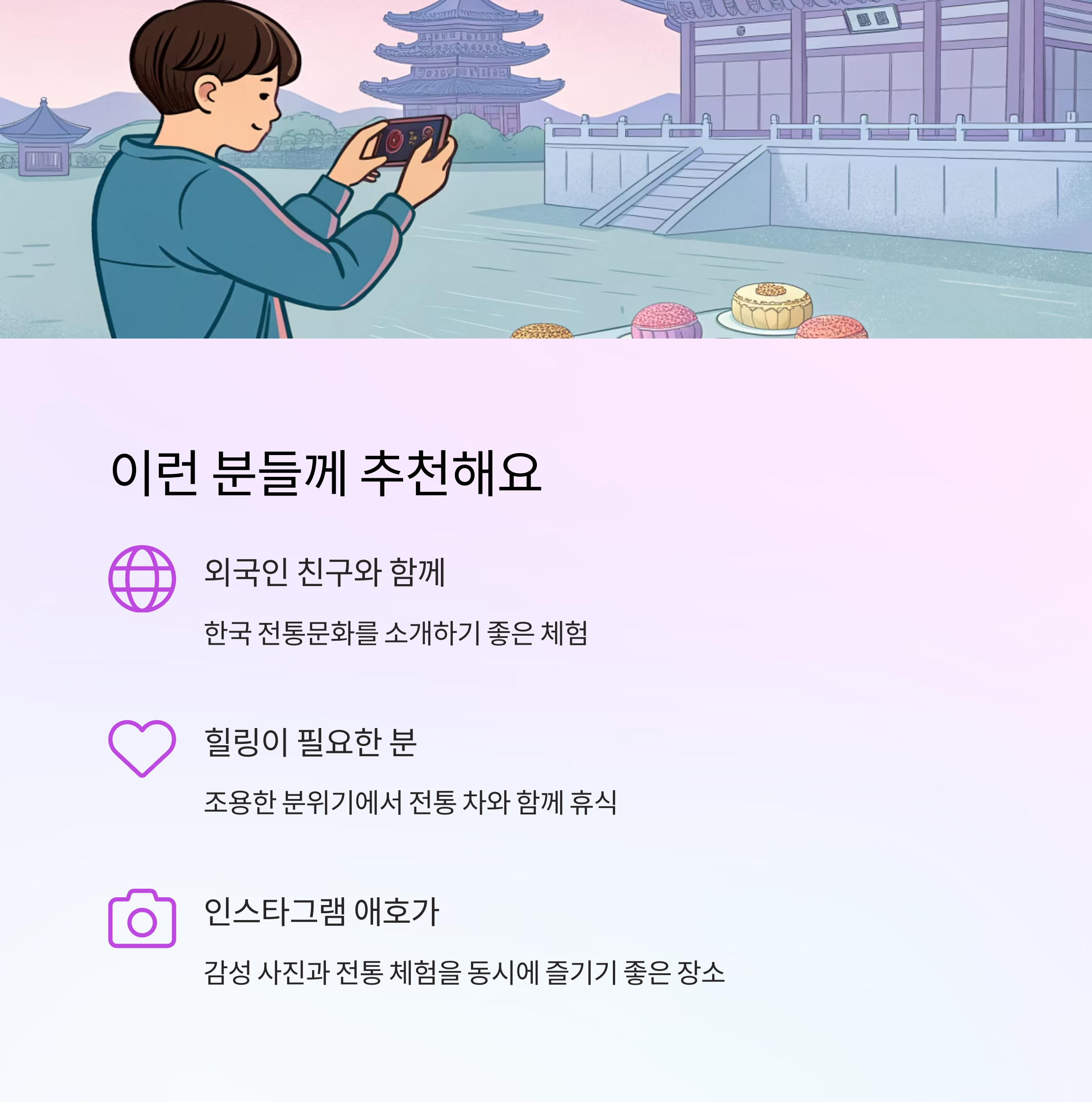| 다담 | 궁중 다과 및 전통 차 체험 | 오후 1시 / 3시 (2회 운영) | 생물방 |