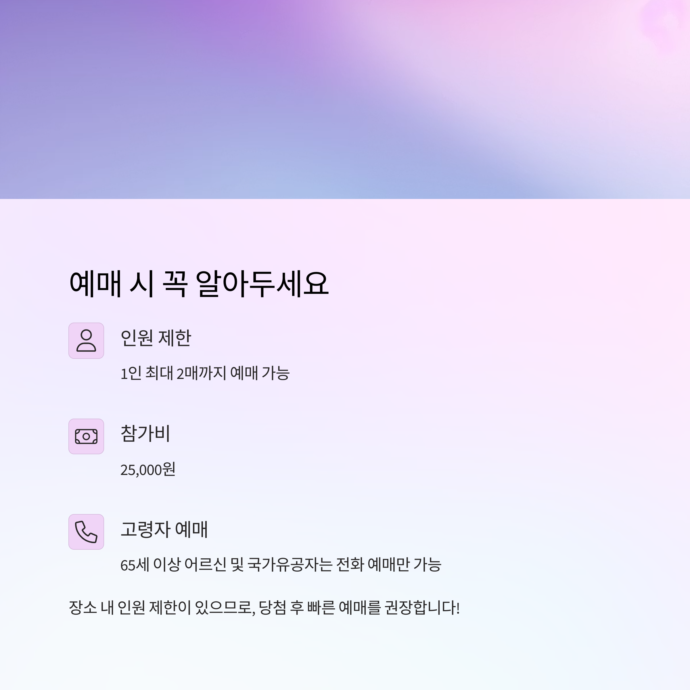 | 특별 안내 | 65세 이상 어르신 및 국가유공자분들은 전화 예매만 가능 |