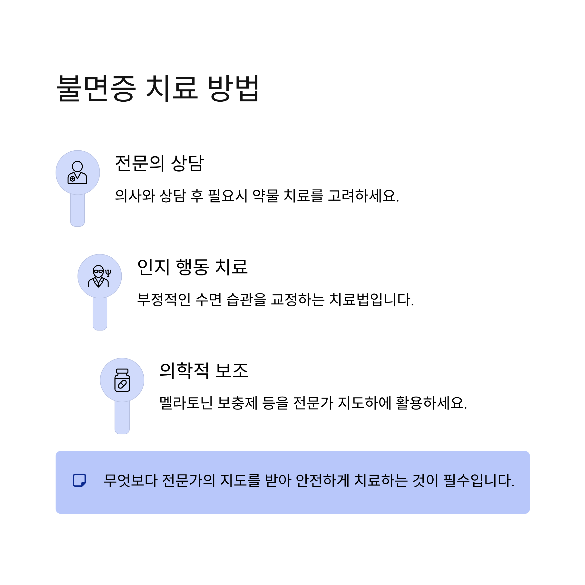 생활 습관 개선에도 불구하고 불면증이 지속된다면 전문적인 치료가 필요합니다.