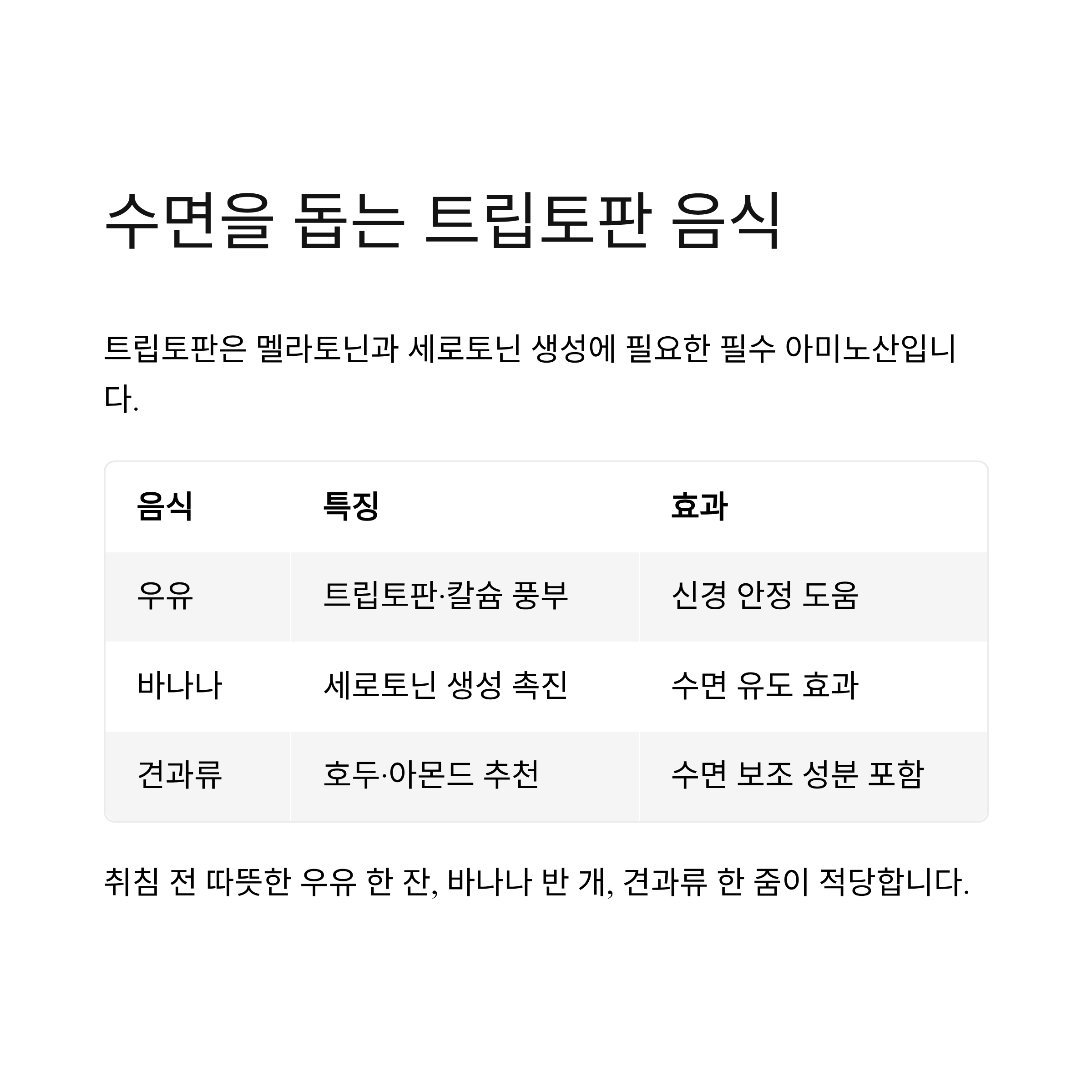 | 우유 | 트립토판·칼슘 풍부, 신경 안정 도움 |
