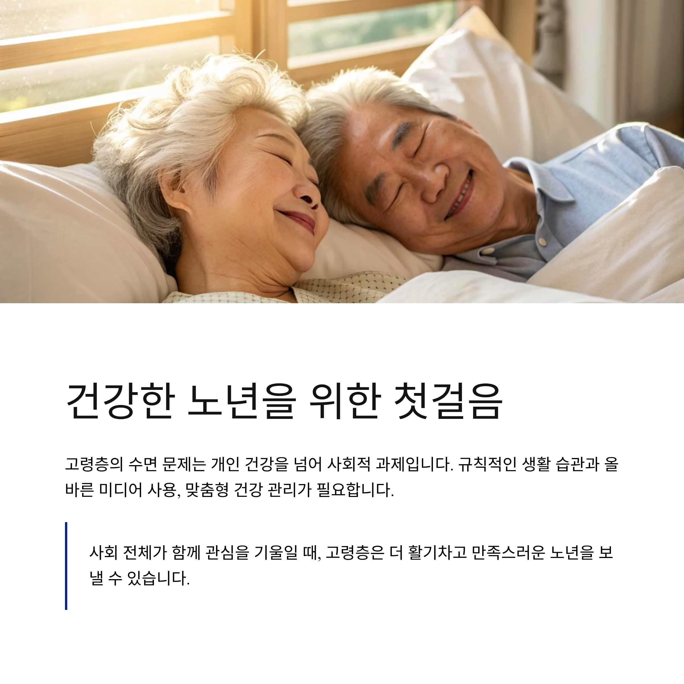 고령층의 수면 시간 감소와 유튜브 시청 증가는 단순한 생활 변화가 아닌 건강과 직결된 문제입니다. 규칙적인 생활 습관, 올바른 미디어 사용, 맞춤형 건강 관리가 필요합니다. 사회 전체가 함께 관심을 기울일 때, 고령층은 더 활기차고 만족스러운 노년을 보낼 수 있을 것입니다.