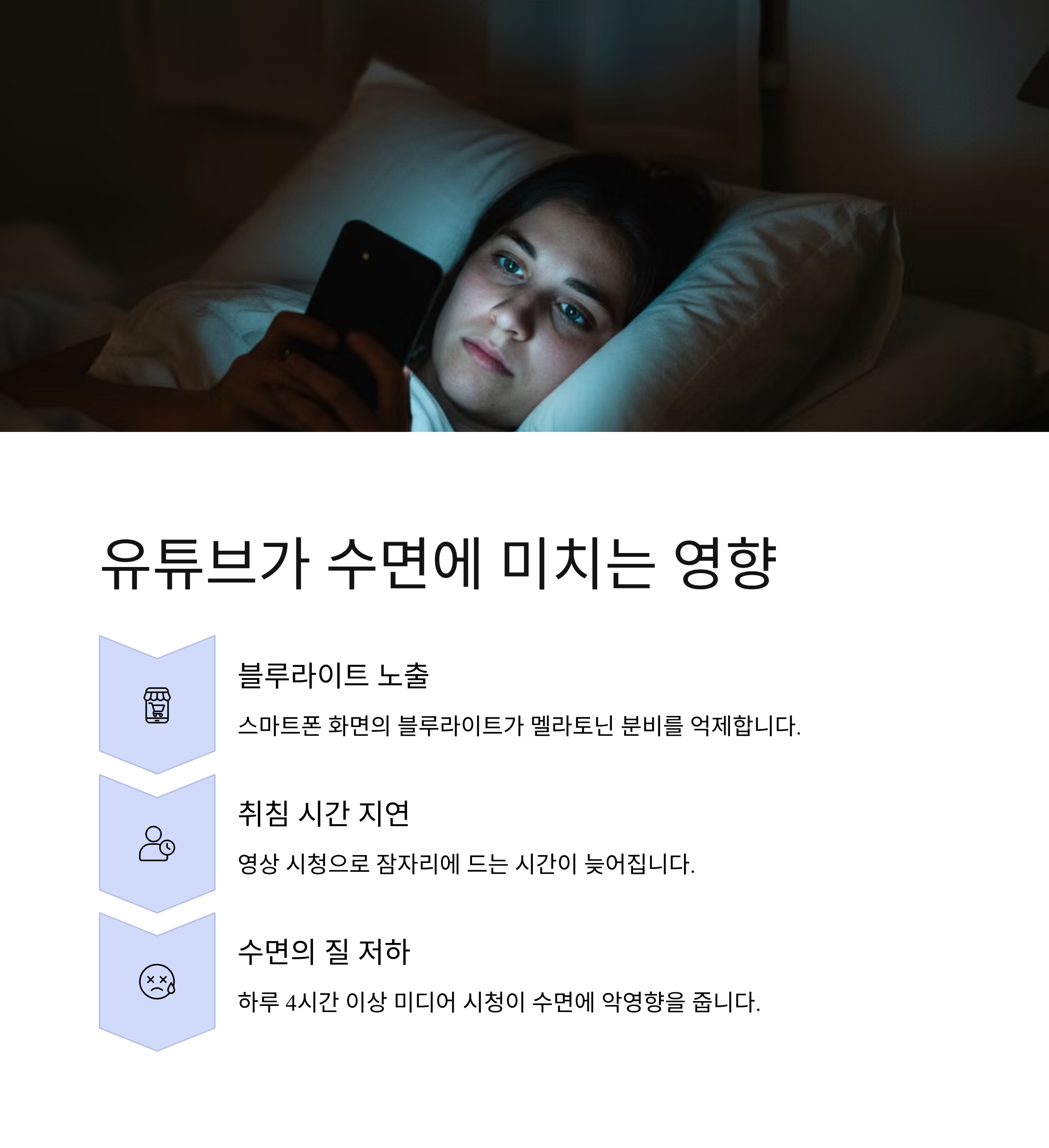 동영상 플랫폼 이용은 여가를 즐기는 좋은 방법이지만, 취침 시간을 늦추는 원인으로 지목됩니다. 특히 스마트폰으로 영상을 시청하면서 블루라이트 노출이 늘어나 멜라토닌 분비가 억제되고 수면의 질이 떨어집니다.